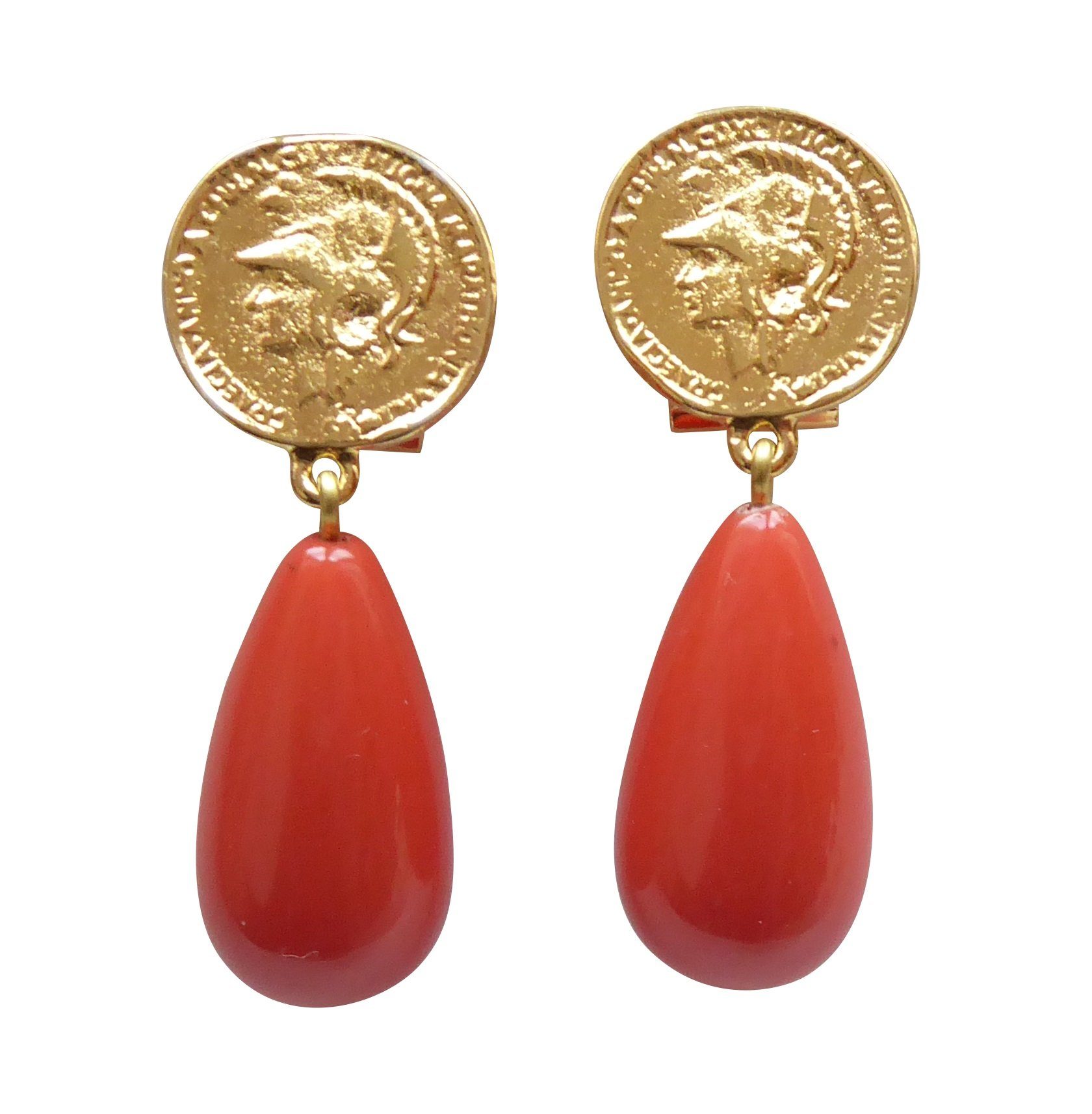 Mal etwas ganz anderes: große vergoldete Ohr-Clips von JustWin in Form einer römischen Münze. Der tropfenförmige korallrote Anhänger bildet einen schönen Kontrast zu der Münze. Der Anhänger besteht aus Acryl, so dass die Clips schön leicht sind. Bei dem Material der Ohrclips handelt es sich um eine antiallergische Metalllegierung mit einer Gelbvergoldung. Das ausgefallene Design dieses Schmuckstücks verleiht Ihnen ein besonderes Flair! Hinter dem Label „JustWin“ stehen die beiden Designer Kurt Justmann und Paul Winter, die Schmuck für Frauen entwerfen, die voluminöse Designs lieben. Die extravaganten, handgearbeiteten Kreationen spielen mit auffälligen Farben, Formen und Oberflächen. Der hochwertige Modeschmuck ist bereits auf der Titelseite der deutschen VOGUE zu bewundern gewesen und erscheint regelmäßig in der Presse. Liebhaberinnen von Statement-Stücken werden bei JustWin nicht widerstehen können! Maße der Ohrringe: Höhe: 4,7 cm, Breite: 1,6 cm.