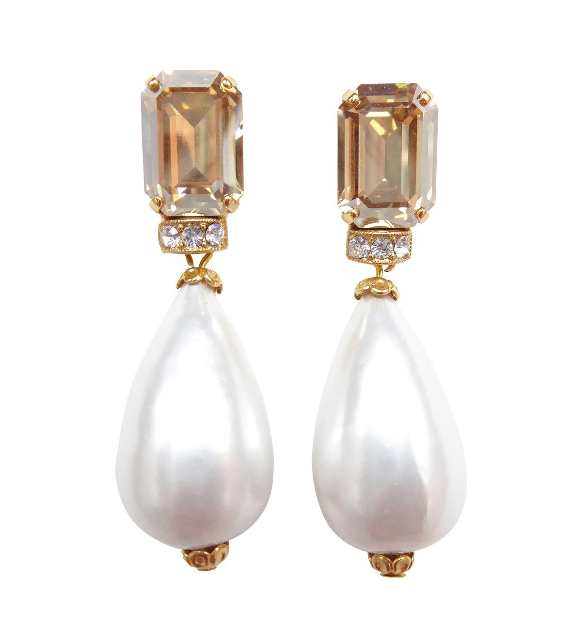 Elegante Ohrclips mit einem facettierten, funkelnden Stein in einem hellen Citrinton. Besonders festlich wirken die Perlenohrringe durch drei kleine, glitzernde Strass-Steine. Der viereckige Stein besteht aus Acryl und die tropfenförmige, weiße Perle aus lackiertem Pappmaché, so dass die Ohrringe sehr leicht sind. Bei dem Material der Clips handelt es sich um eine antiallergische Metalllegierung mit einer Gelbvergoldung. Der Perlen-Stein-Mix sorgt für ein fröhliches Flair! Hinter dem Label „JustWin“ stehen die beiden Designer Kurt Justmann und Paul Winter, die Schmuck für Frauen entwerfen, die voluminöse Designs lieben. Die extravaganten, handgearbeiteten Kreationen spielen mit auffälligen Farben, Formen und Oberflächen. Der hochwertige Modeschmuck ist bereits auf der Titelseite der deutschen VOGUE zu bewundern gewesen und erscheint regelmäßig in der Presse. Liebhaberinnen von Statement-Stücken werden bei JustWin nicht widerstehen können! Maße der Ohrringe: Höhe: 5,0 cm, Breite: 1,7 cm.