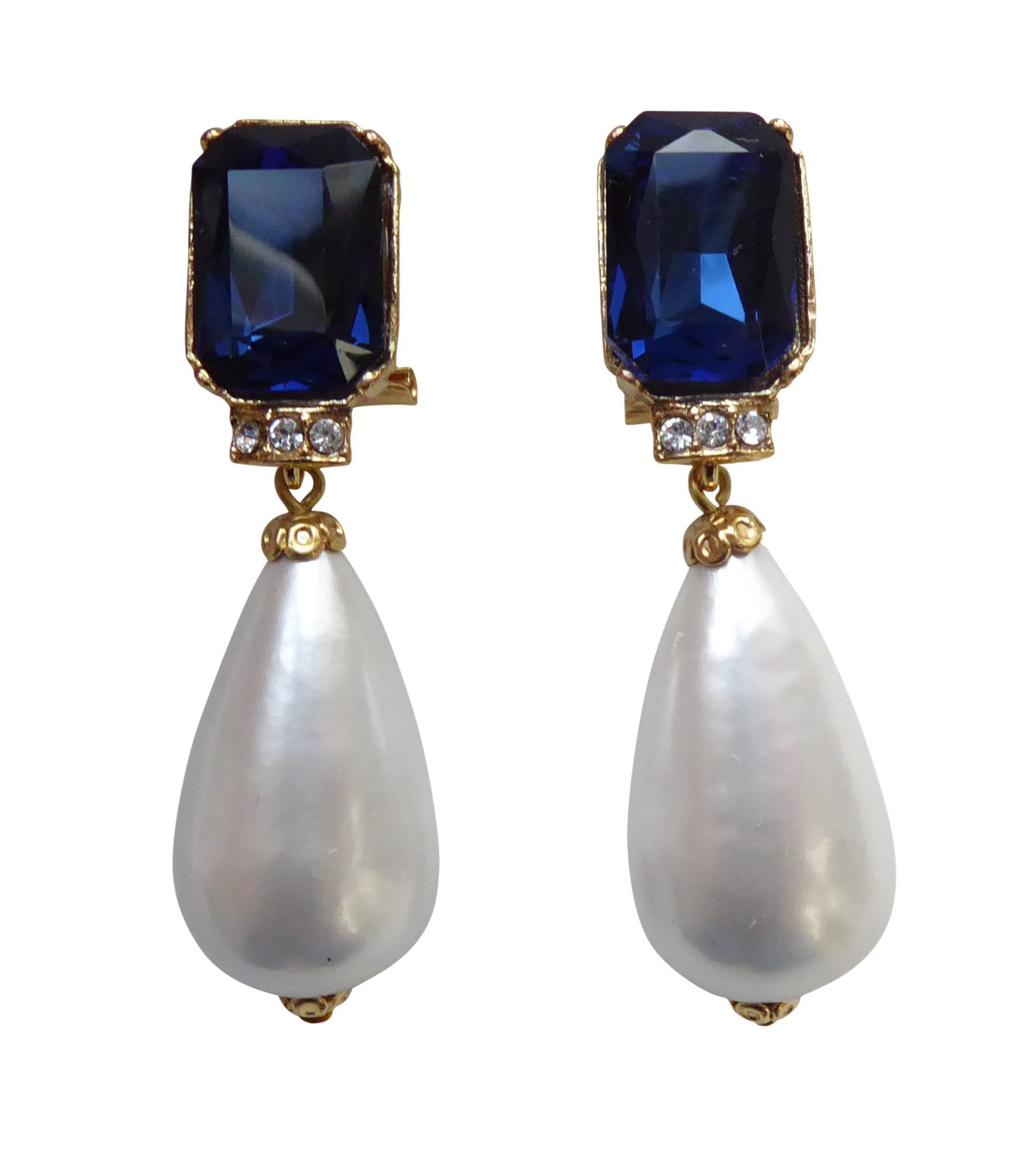 Elegante Ohrclips mit einem facettierten, funkelnden Stein in einem schönen Dunkelblau. Besonders festlich wirken die Perlenohrringe durch drei kleine, glitzernde Strass-Steine. Der viereckige Stein besteht aus Acryl und die tropfenförmige, weiße Perle aus lackiertem Pappmaché, so dass die Ohrringe sehr leicht sind. Bei dem Material der Clips handelt es sich um eine antiallergische Metalllegierung mit einer Gelbvergoldung. Der Perlen-Stein-Mix sorgt für ein fröhliches Flair! Hinter dem Label „JustWin“ stehen die beiden Designer Kurt Justmann und Paul Winter, die Schmuck für Frauen entwerfen, die voluminöse Designs lieben. Die extravaganten, handgearbeiteten Kreationen spielen mit auffälligen Farben, Formen und Oberflächen. Der hochwertige Modeschmuck ist bereits auf der Titelseite der deutschen VOGUE zu bewundern gewesen und erscheint regelmäßig in der Presse. Liebhaberinnen von Statement-Stücken werden bei JustWin nicht widerstehen können! Maße der Ohrringe: Höhe: 5,0 cm, Breite: 1,7 cm.