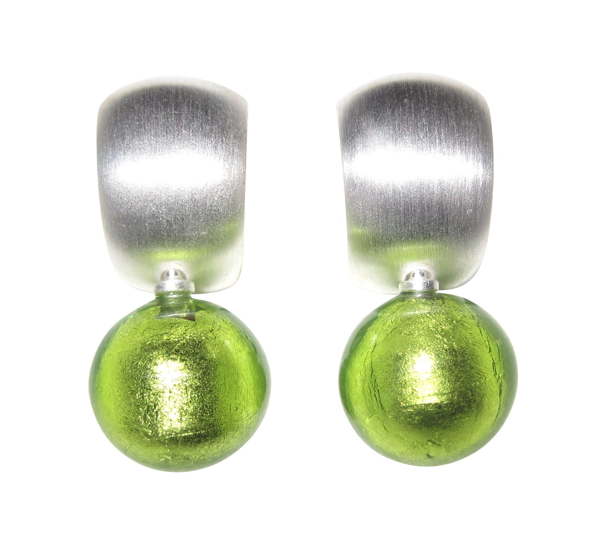 Grüne exklusive Muranoglasclips mit großer Farbintensität. Die schillernden Glasperlen werden auf der Insel Murano vor Venedig in aufwendiger Handarbeit hergestellt, wobei Blattgold (weiß oder gelb) in die Perle eingearbeitet wird. Das Gold ist somit versiegelt und gibt der Perle die Brillanz und einen Hauch von Luxus. Bei dem Muranoglas handelt es sich um gehärtetes Spezialglas, welches nur auf Murano mit dieser intensiven Farbtiefe und Strahlkraft produziert wird. Diese Art der Perlenherstellung ist ein wahres Kunsthandwerk und jede Perle somit ein Unikat. Die Creole besteht aus gebürstetem Sterlingsilber (925-er Silber) und wird qualitativ sehr hochwertig von einer Goldschmiedewerkstatt in Pforzheim gearbeitet. Maße der Clips: Höhe (mit Creole): 2,8 cm, Breite Creole: 1,2 cm, Perle Durchmesser: 1,2 cm. Die Clips passen zu der Muranoglaskette bunt.