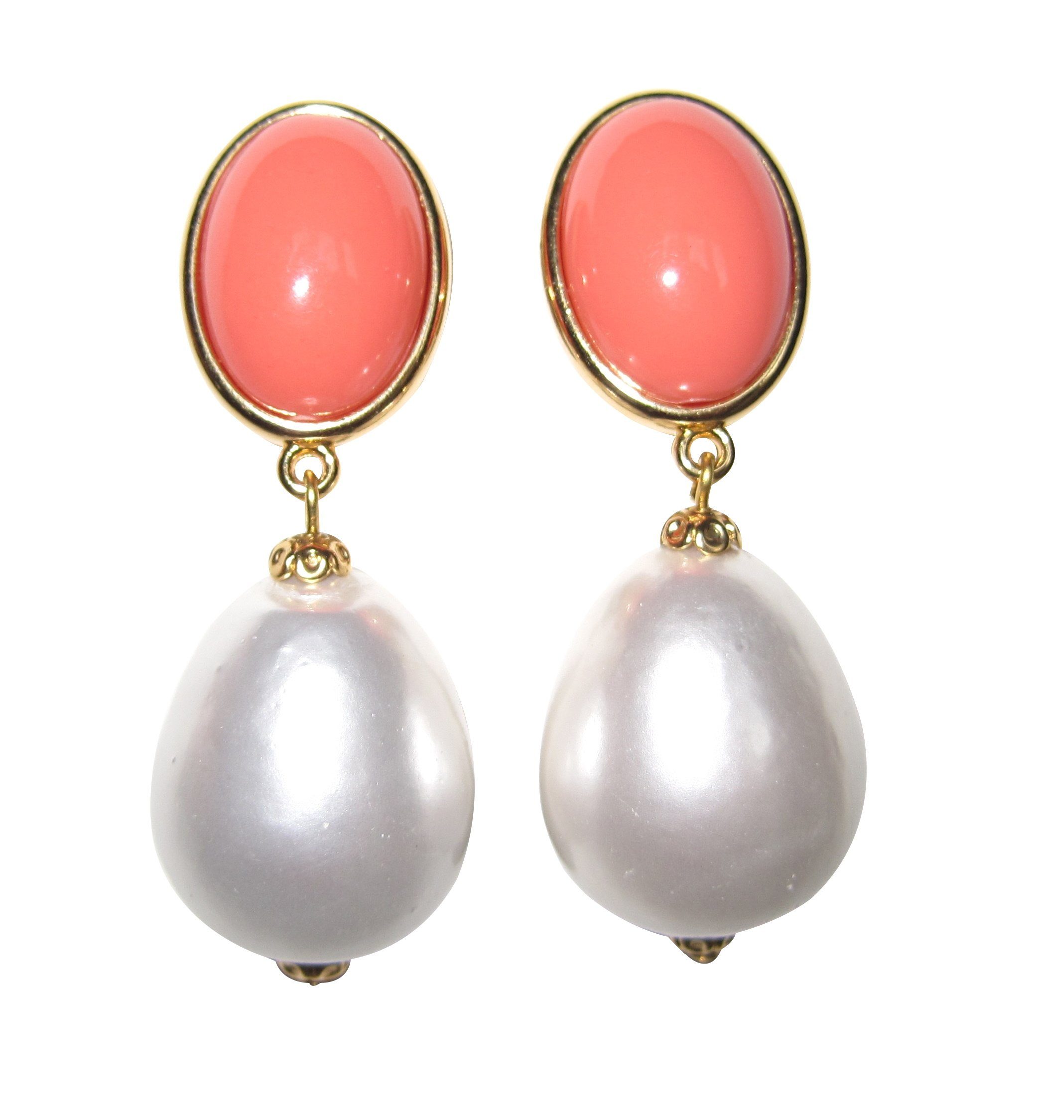 Ein absoluter Hingucker: Hübsche Ohrclips von JustWin mit einem ovalen Stein in einem korallen-farbigen Orange und mit einem weißen Anhänger, der einer Barockperle nachempfunden ist. Der Stein besteht aus Acryl und die Perle aus lackiertem Pappmaché, so dass die Clips extrem leicht sind. Bei dem Material der Ohrclips handelt es sich um eine antiallergische Metalllegierung mit einer Gelbvergoldung. Der Perlen-Stein-Mix sorgt für ein fröhliches Flair! Hinter dem Label „JustWin“ stehen die beiden Designer Kurt Justmann und Paul Winter, die Schmuck für Frauen entwerfen, die voluminöse Designs lieben. Die extravaganten, handgearbeiteten Kreationen spielen mit auffälligen Farben, Formen und Oberflächen. Der hochwertige Modeschmuck ist bereits auf der Titelseite der deutschen VOGUE zu bewundern gewesen und erscheint regelmäßig in der Presse. Liebhaberinnen von Statement-Stücken werden bei JustWin nicht widerstehen können! Maße der Ohrringe: Höhe: 5,3 cm, Breite: 2,0 cm.