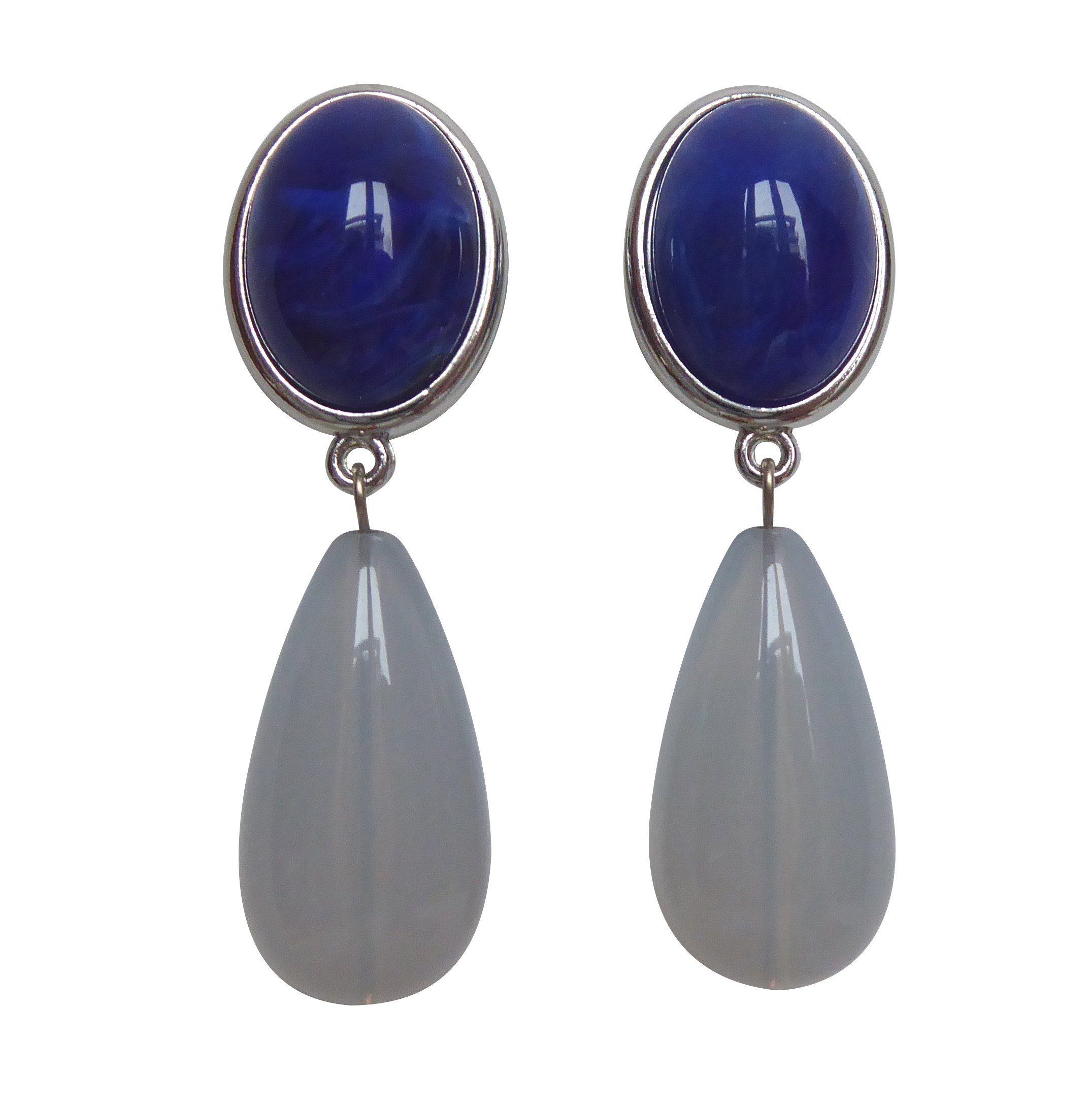 Opulente, silber-farbene Ohr-Clips von JustWin mit einem ovalen, dunkelblauen Stein und mit einem tropfenförmigen grau-blauen Anhänger. Der Stein und der Anhänger bestehen aus Acryl, so dass die Ohrringe extrem leicht sind. Bei dem Material der Ohrringe handelt es sich um eine antiallergene, silberhaltige Metalllegierung. Diese großen Clips sind ein absoluter Hingucker! Hinter dem Label „JustWin“ stehen die beiden Designer Kurt Justmann und Paul Winter, die Schmuck für Frauen entwerfen, die voluminöse Designs lieben. Die extravaganten, handgearbeiteten Kreationen spielen mit auffälligen Farben, Formen und Oberflächen. Der hochwertige Modeschmuck ist bereits auf der Titelseite der deutschen VOGUE zu bewundern gewesen und erscheint regelmäßig in der Presse. Liebhaberinnen von Statement-Stücken werden bei JustWin nicht widerstehen können! Maße der Ohrringe: Höhe: 5,0 cm, Breite: 1,5 cm.