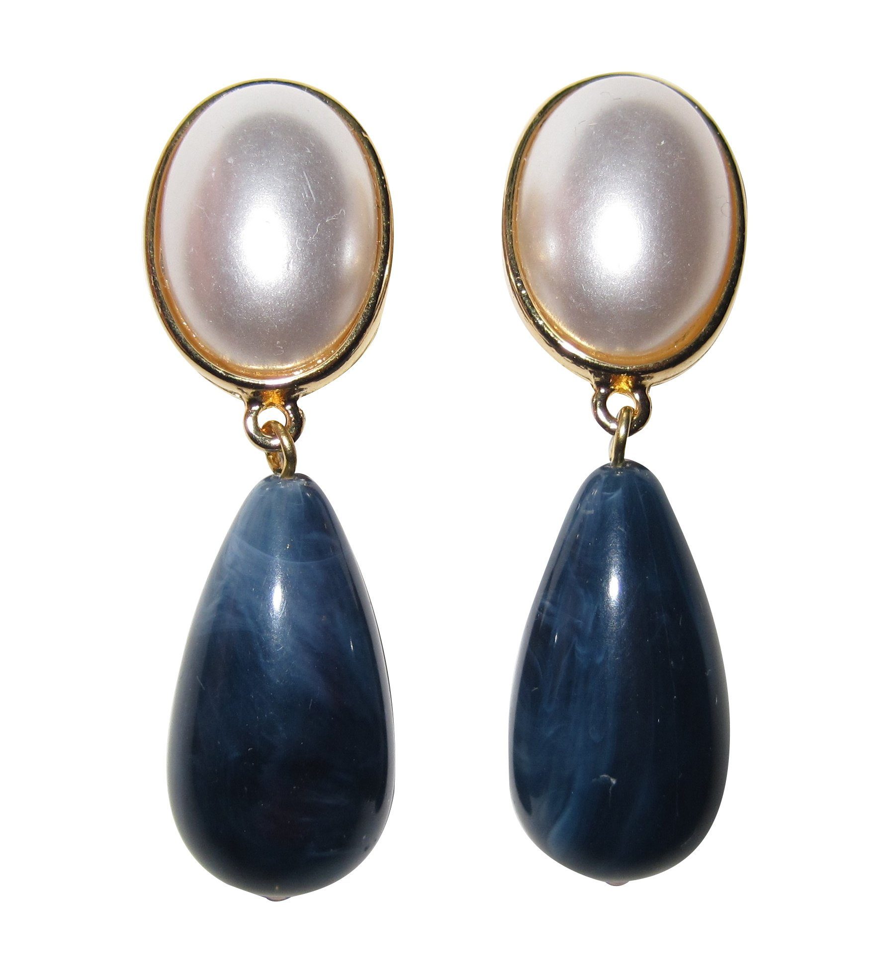 Opulente Ohr-Clips von JustWin mit einem ovalen Stein, der aussieht wie eine weiße Perle, und mit einem tropfenförmigen blau marmorierten Anhänger. Der Stein und der Anhänger bestehen aus Acryl, so dass die Ohrringe extrem leicht sind. Bei dem Material der Clips handelt es sich um eine antiallergische Metalllegierung mit einer Gelbvergoldung. Diese großen Ohrclips sind ein absoluter Hingucker! Hinter dem Label „JustWin“ stehen die beiden Designer Kurt Justmann und Paul Winter, die Schmuck für Frauen entwerfen, die voluminöse Designs lieben. Die extravaganten, handgearbeiteten Kreationen spielen mit auffälligen Farben, Formen und Oberflächen. Der hochwertige Modeschmuck ist bereits auf der Titelseite der deutschen VOGUE zu bewundern gewesen und erscheint regelmäßig in der Presse. Liebhaberinnen von Statement-Stücken werden bei JustWin nicht widerstehen können! Maße der Ohrringe: Höhe: 5,0 cm, Breite: 1,5 cm.