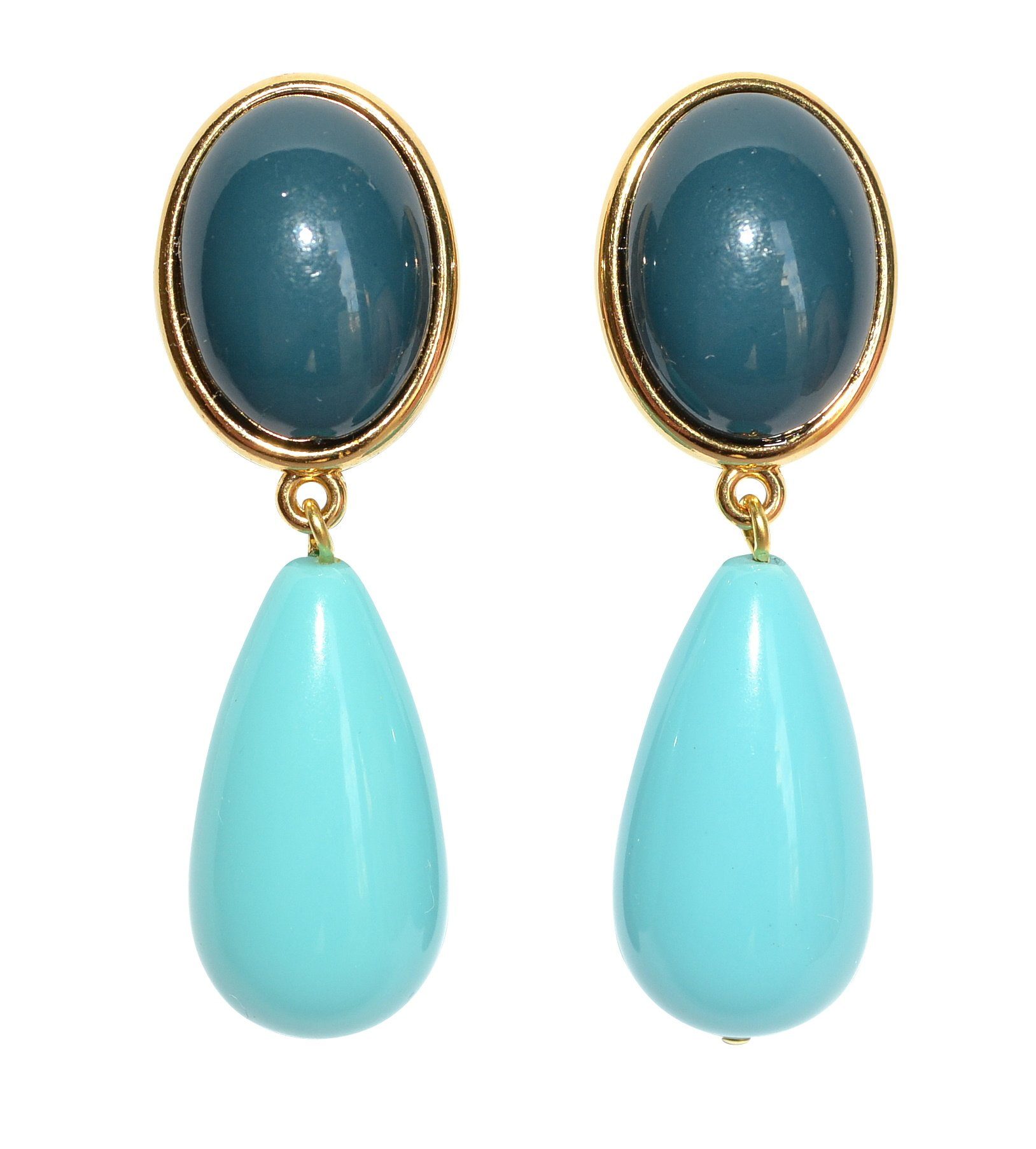 Auffallende Ohr-Clips von JustWin mit einem ovalen petrol-blauen Stein und einem tropfenförmigen Anhänger in einem auffallenden Türkisblau. Der Stein und der Anhänger bestehen aus Acryl, so dass die Ohrringe extrem leicht sind. Bei dem Material der Ohrringe handelt es sich um eine antiallergische Metalllegierung mit einer Gelbvergoldung. Diese großen Clips sind ein absoluter Hingucker!Hinter dem Label „JustWin“ stehen die beiden Designer Kurt Justmann und Paul Winter, die Schmuck für Frauen entwerfen, die voluminöse Designs lieben. Die extravaganten, handgearbeiteten Kreationen spielen mit auffälligen Farben, Formen und Oberflächen. Der hochwertige Modeschmuck ist bereits auf der Titelseite der deutschen VOGUE zu bewundern gewesen und erscheint regelmäßig in der Presse. Liebhaberinnen von Statement-Stücken werden bei JustWin nicht widerstehen können! Maße der Ohrringe: Höhe: 5,0 cm, Breite: 1,5 cm.