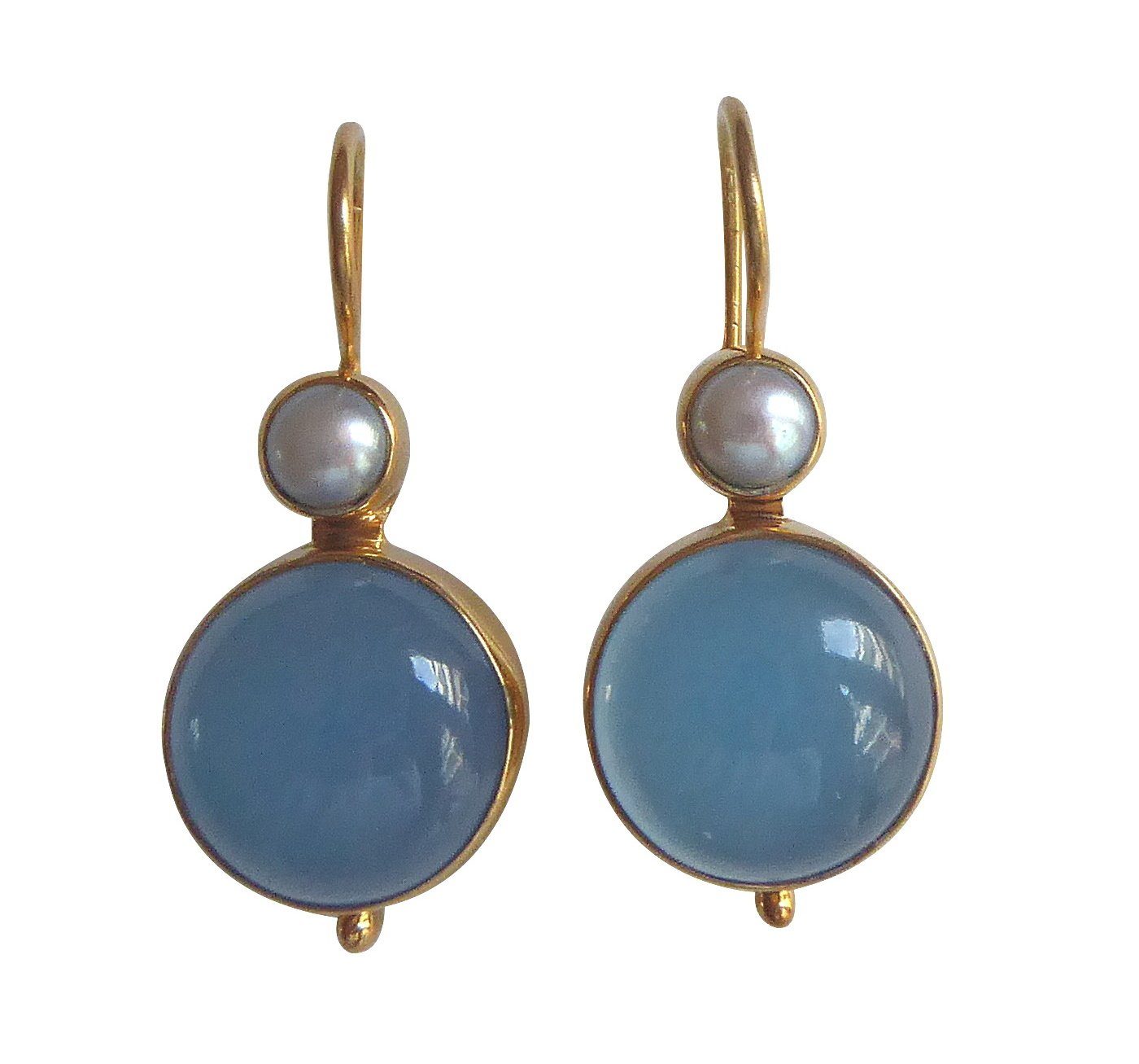Klassische, relativ große Ohrringe mit einem leuchtend blauen Chalzedon und einer weißen Süßwasserperle, die zu jedem Outfit äußerst dekorativ sind. Das Material dieser hochwertigen Ohrringe ist Silber vergoldet und ist antiallergisch und gut verträglich. Die schicken Ohrringe sind hinten mit einem Haken verschließbar. Diese edlen, eleganten Vintage-Ohrringe werden in Florenz in einer kleinen Schmuck-Werkstatt in liebevoller und aufwendiger Handarbeit gefertigt, so dass jedes Schmuckstück ein einzigartiges Unikat ist. Daher sind kleine Abweichungen zu dem Bild möglich. Die Ohrringe sind inspiriert durch historischen, klassischen Schmuck von Renaissance-Gemälden aus den Uffizien. Durch ihr außergewöhnliches Design im Antik- und Retro-Look sind sie besonders geeignet als Geschenk zum Geburtstag, Weihnachten, Konfirmation oder Valentinstag für Frauen oder Mädchen. Maße der Ohrringe: Höhe (ohne Gehänge): 2,3 cm, Breite: 1,4 cm.