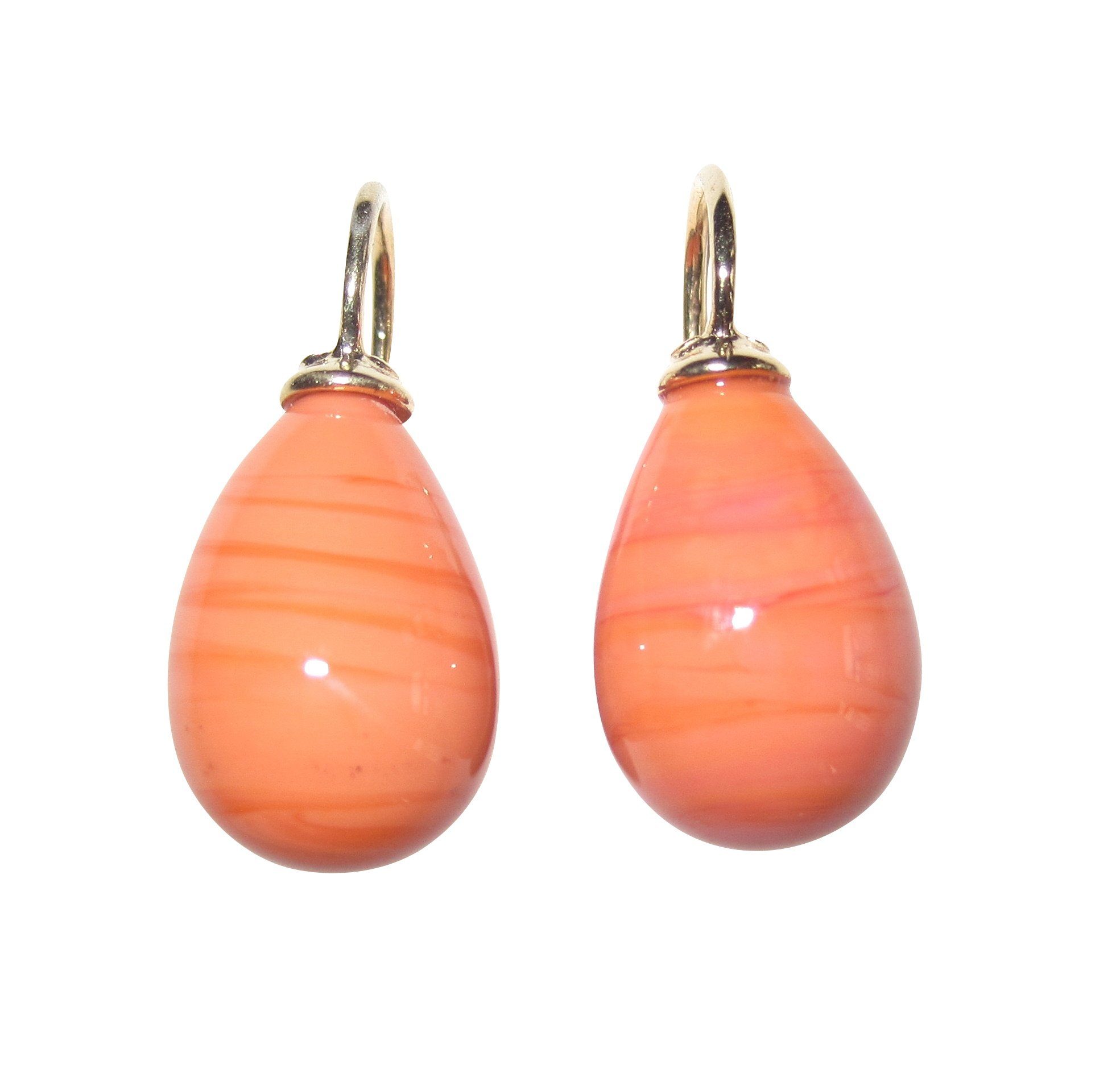 Stilvolle, trendige lachsfarbene Glasohrringe in Tropfenform aus der Werkstatt der bekannten Schmuck-Designerin Heide Heinzendorff. Die hübschen, stylischen Ohrringe aus böhmischem Quarzglas werden nach alter, aussterbender Glashandwerk-Tradition in hochwertiger Handarbeit gefertigt. Jede Perle ist ein Unikat. Daher sind kleine Farb- und Formabweichungen vom Foto möglich. Der Bügel der Ohrringe besteht aus 925-er Sterling-Silber mit einer Gelbgold-Plattierung, ist antiallergisch und sehr gut verträglich. Der Bügel ist offen und kann nicht verschlossen werden. Die hängenden Tropfen-Ohrringe sind einfach anzulegen. Diese modischen und zeitlosen Ohrhänger sind leicht und liegen absolut im Trend. Es gibt sie in vielen verschieden bunten Farbtönen - in zarten Pastell-Tönen bis zu knalligen Farben. So finden Sie immer das passende Paar für jede Gelegenheit - egal ob in der Freizeit, im Alltag, im Büro oder für einen festlichen Anlass wie zum Beispiel ein Fest, eine Hochzeit, ein Ball oder auch eine legere Party. Durch ihre schlichte und einfache Form passen sie zu jedem Outfit - ob zum eleganten Abendkleid oder zum sportlichen Casual-Look. Ein klassisches, edles und modernes Fashion-Accessoire und ein schöner Allrounder für Frühling, Sommer, Herbst und Winter! Maße der Ohrringe: Höhe (ohne Gehänge): 1,7 cm, Breite: 1,2 cm.