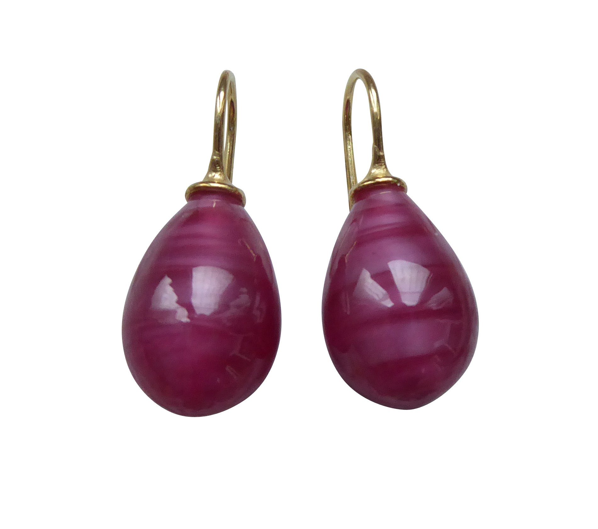 Stilvolle, trendige rubinrote Glasohrringe in Tropfenform aus der Werkstatt der bekannten Schmuck-Designerin Heide Heinzendorff. Die hübschen, stylischen Ohrringe aus böhmischem Quarzglas werden nach alter, aussterbender Glashandwerk-Tradition in hochwertiger Handarbeit gefertigt. Jede Perle ist ein Unikat. Daher sind kleine Farb- und Formabweichungen vom Foto möglich. Der Bügel der Ohrringe besteht aus 925-er Sterling-Silber mit einer Gelbgold-Plattierung, ist antiallergisch und sehr gut verträglich. Der Bügel ist offen und kann nicht verschlossen werden. Die hängenden Tropfen-Ohrringe sind einfach anzulegen. Diese modischen und zeitlosen Ohrhänger sind leicht und liegen absolut im Trend. Es gibt sie in vielen verschieden bunten Farbtönen - in zarten Pastell-Tönen bis zu knalligen Farben. So finden Sie immer das passende Paar für jede Gelegenheit - egal ob in der Freizeit, im Alltag, im Büro oder für einen festlichen Anlass wie zum Beispiel ein Fest, eine Hochzeit, ein Ball oder auch eine legere Party. Durch ihre schlichte und einfache Form passen sie zu jedem Outfit - ob zum eleganten Abendkleid oder zum sportlichen Casual-Look. Ein klassisches, edles und modernes Fashion-Accessoire und ein schöner Allrounder für Frühling, Sommer, Herbst und Winter! Maße der Ohrringe: Höhe (ohne Gehänge): 1,7 cm, Breite: 1,2 cm.