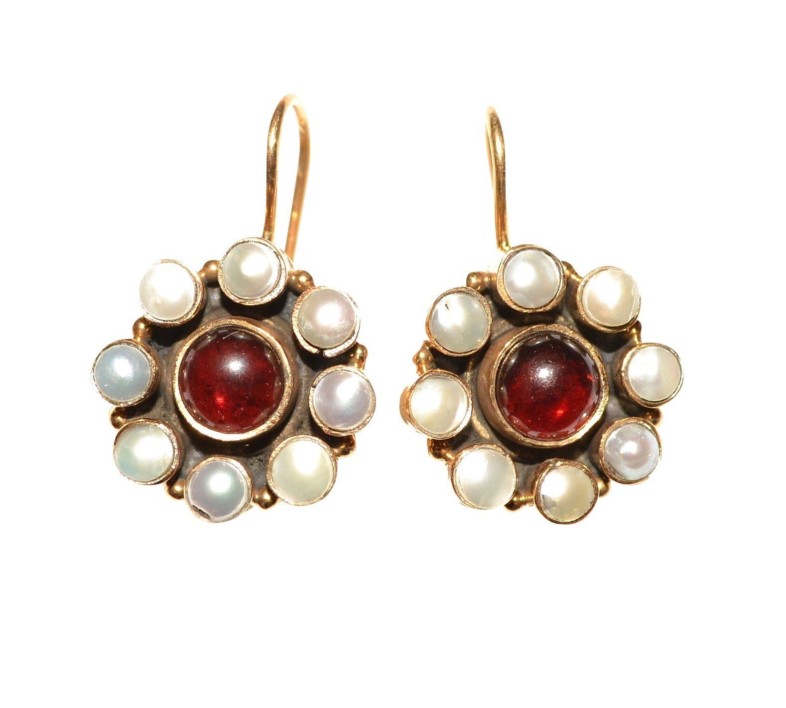 Elegante, historisch inspirierte Perlen-Ohrringe mit einem roten Granat und einem Kranz von kleinen Süßwasserperlen. Das Material dieser hochwertigen Ohrhänger ist Silber vergoldet und ist antiallergisch und gut verträglich. Die Granat-Ohrringe sind hinten mit einem Haken verschließbar. Diese edlen, eleganten Vintage-Ohrringe werden in Florenz in einer kleinen Schmuck-Werkstatt in liebevoller und aufwendiger Handarbeit gefertigt, so dass jedes dieser außergewöhnlichen Schmuckstücke ein einzigartiges Unikat ist. Daher sind kleine Abweichungen zu dem Bild möglich. Die hübschen und hochwertigen Ohrringe sind inspiriert durch historischen, klassischen Schmuck von Renaissance-Gemälden aus den Uffizien. Es liegt ganz im Trend, dass Ohrringe auf alt gemacht werden und antik und nostalgisch wirken. Durch ihr zeitlos schönes Design im Antik-Look bzw. Retro-Look sind sie besonders geeignet als wunderschönes Geschenk zum Geburtstag, Weihnachten, Konfirmation oder Valentinstag für Frauen oder Mädchen mit Stil und Anspruch. Maße der Ohrringe: Höhe (ohne Gehänge): 1,7 cm, Breite: 1,7 cm.