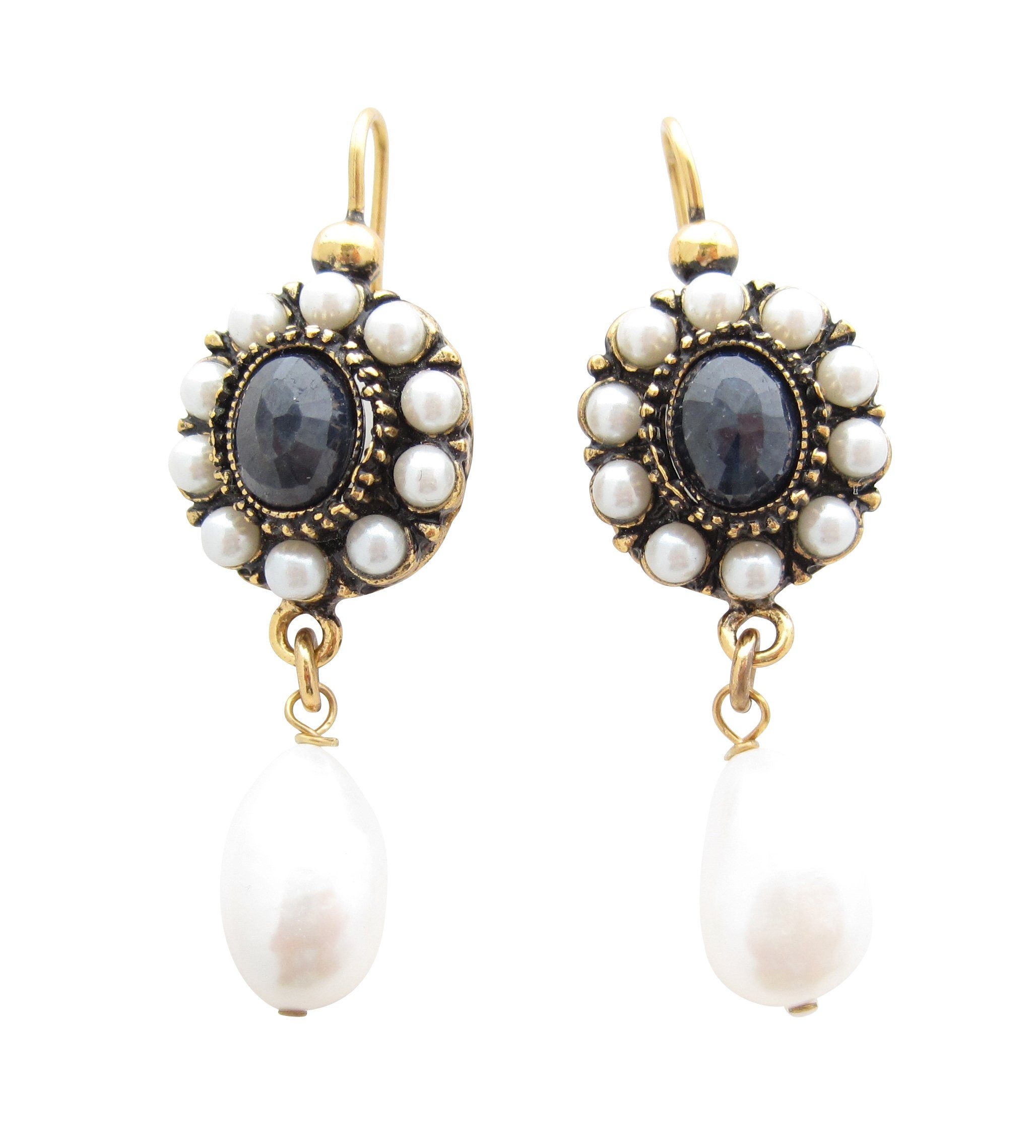 Exquisite Ohrringe mit einem dunkelblauen Saphir und kleinen, weißen Süßwasserperlen. Der Anhänger mit einer länglichen Süßwasserperle verleiht den Ohrringen einen noblen Eindruck. Die stilvollen Ohrringe sind Messing vergoldet und eignen sich perfekt für einen feierlichen Anlass. Diese edlen, eleganten Ohrringe werden in Florenz in der Werkstatt des berühmten italienischen Designers Giampiero Alcozer in liebevoller Handarbeit gefertigt. Sie sind inspiriert durch historischen Schmuck der Renaissance und des Barock. Durch ihr außergewöhnliches Design sind sie ideal für Feste und Hochzeiten - aber auch ein stilvoller Begleiter für jeden Tag. Maße der Ohrringe: Höhe (ohne Gehänge): 3,5 cm, Breite: 1,5 cm.