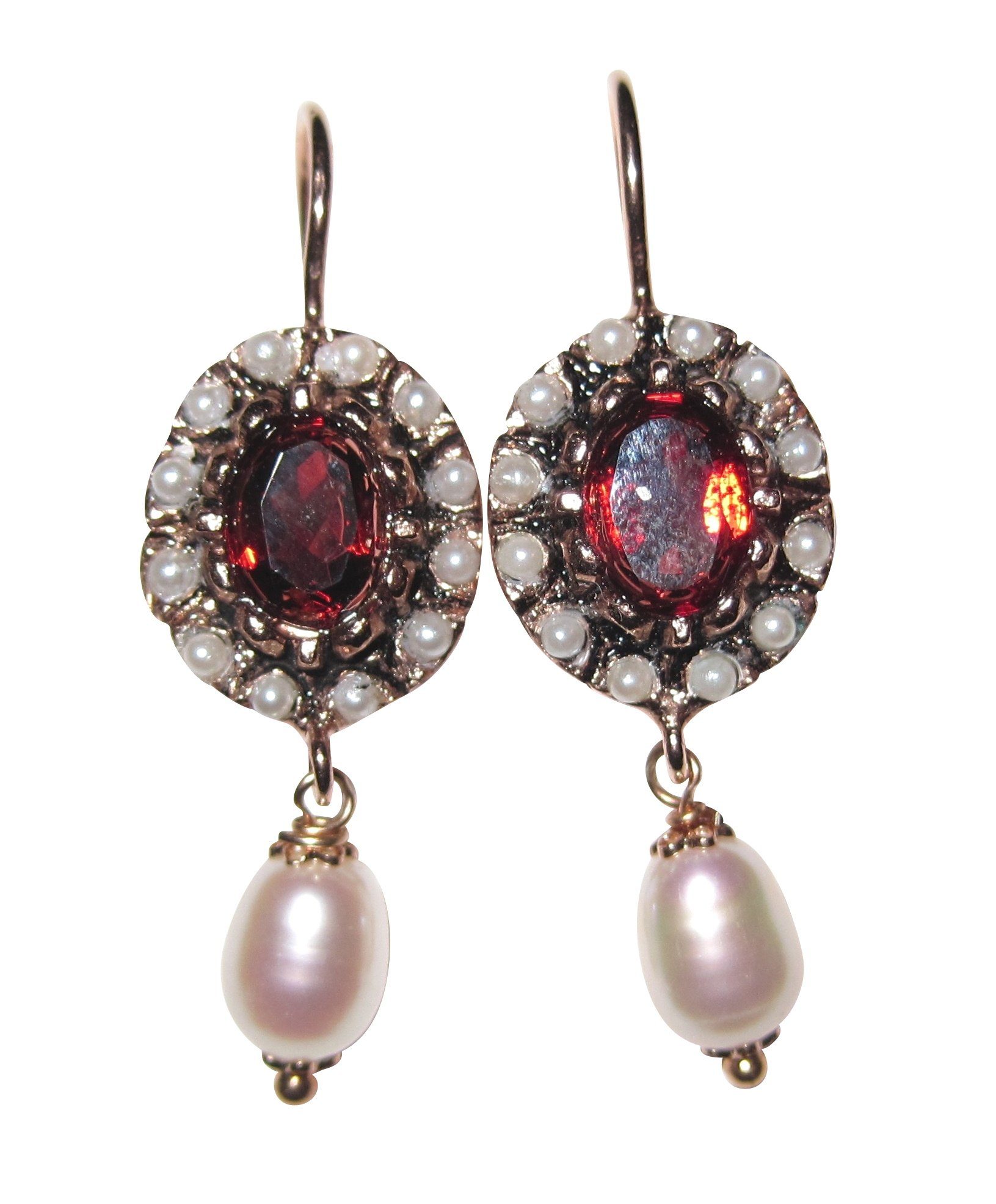 Exquisite, antik wirkende Ohrringe mit einem weinroten Granatstein und einem Kranz von kleinen synthetischen Perlen. Der Anhänger mit einer länglichen Süßwasserperle verleiht den Ohrringen einen noblen Eindruck. Die stilvollen Ohrringe haben einen praktischen Brisurverschluss und bestehen aus Sterlingsilber mit einer 18-karätigen Rotgoldplattierung. Perfekt für einen feierlichen Auftritt! Dieser wertvolle Modeschmuck wird in liebevoller Handarbeit in kleinen italienischen Ateliers gefertigt. Dabei werden hochwertige Steine sowie antiallergische Edelmetalle verwendet. Das italienische Design der Ohrringe besticht durch das Zusammenspiel von Farben mit historischen Formen. Maße der Ohrringe: Höhe (ohne Gehänge): 3,0 cm, Breite: 1,4 cm.