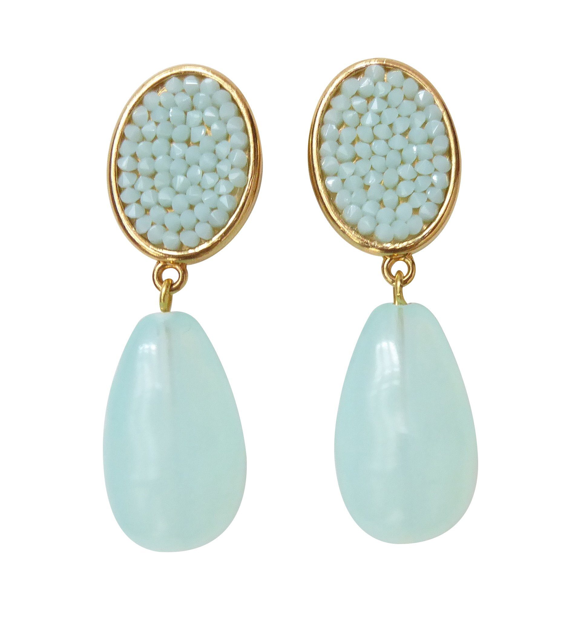 Glamour pur: Glitzernde Clip-Ohrstecker (für Ohrlöcher) von JustWin, die mit funkelnden mintgrünen Steinchen besetzt sind und einen tropfenförmigen Anhänger in einem leuchten Lagunen-Grün haben. Die kleinen Steinchen und der Anhänger bestehen aus Acryl, so dass die Ohrringe extrem leicht sind. Bei dem Material der Ohrringe handelt es sich um eine antiallergische Metalllegierung mit einer Gelbvergoldung. Diese großen Ohrringe sind ein absoluter Hingucker! Hinter dem Label „JustWin“ stehen die beiden Designer Kurt Justmann und Paul Winter, die Schmuck für Frauen entwerfen, die voluminöse Designs lieben. Die extravaganten, handgearbeiteten Kreationen spielen mit auffälligen Farben, Formen und Oberflächen. Der ins Auge fallende Modeschmuck ist bereits auf der Titelseite der deutschen VOGUE zu bewundern gewesen und erscheint regelmäßig in der Presse. Liebhaberinnen von Statement-Stücken werden bei JustWin nicht widerstehen können! Maße der Ohrringe: Höhe: 5,0 cm, Breite: 1,6 cm.