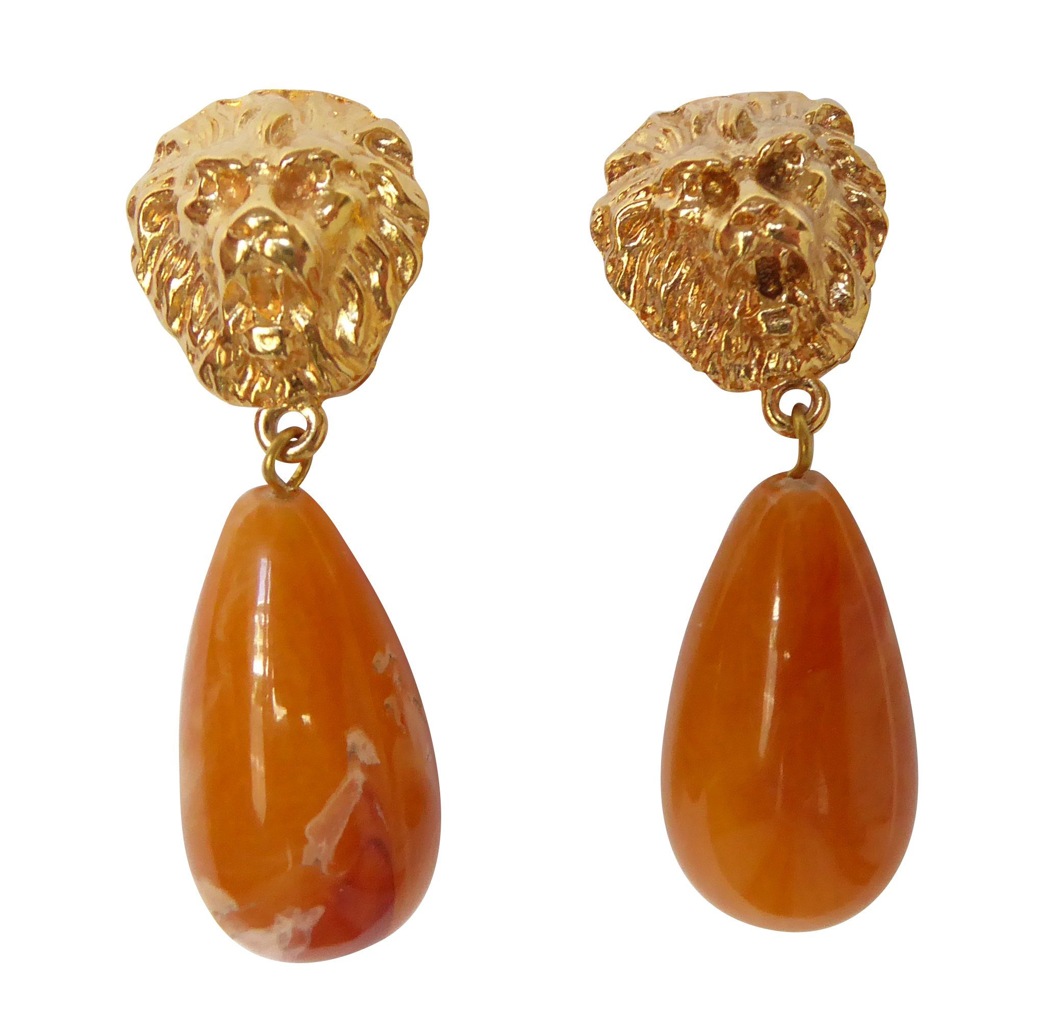 Besonders auffällige Clip-Ohrstecker (für Ohrlöcher) von JustWin mit einem vergoldeten Löwen-Kopf und mit einem tropfenförmigen orange bzw. bernsteinfarben marmoriertem Anhänger aus Acrylglas. Die Ohrringe sind extrem leicht und angenehm zu tragen. Bei dem Material der schönen Statement-Ohrringe handelt es sich um eine Metalllegierung mit einer Gelbvergoldung. Das Material ist antiallergen und sehr gut verträglich. Durch ihre Размер wirken die stylischen, hübschen Ohrstecker besonders eindrucksvoll und sind ein absoluter Hingucker! Hinter dem Label „JustWin“ stehen die beiden Designer Kurt Justmann und Paul Winter, die modischen, glamourösen Statement-Schmuck für Frauen entwerfen, die voluminöse und bunte Designs lieben. Die extravaganten, handgearbeiteten Kreationen sind ein eleganter Blickfang und spielen mit auffälligen, fröhlichen Farben, Formen und Oberflächen. Der hochwertige, stilvolle Modeschmuck ist bereits auf der Titelseite der deutschen VOGUE zu bewundern gewesen und erscheint regelmäßig in der Presse. Liebhaberinnen von Statement-Ohrringen in vielen verschiedenen Trend-Farben werden bei JustWin nicht widerstehen können! Moderner, edler und individueller Mode-Stil für jedes Outfit. Die schicken und gleichzeitig auch klassischen Designer-Ohrringe werten jeden Look auf, egal bei welcher Gelegenheit: ob im Büro, in der Freizeit, im Urlaub oder bei einem festlichen Anlass wie einer Feier, Party, Ball, Hochzeit, Konfirmation, Oktoberfest etc. Sie werden gerne zusammen mit einem Dirndl als ausgefallenes Trachten-Schmuckstück getragen. Dieser tolle Bestseller ist auch ein wunderbares Geschenk zum Geburtstag, Weihnachten, Hochzeitstag, Valentinstag oder dergleichen und ein besonderes Must-Have für Frauen und Mädchen. Maße der Ohrringe: Höhe: 4,7 cm, Breite: 1,5 cm.
