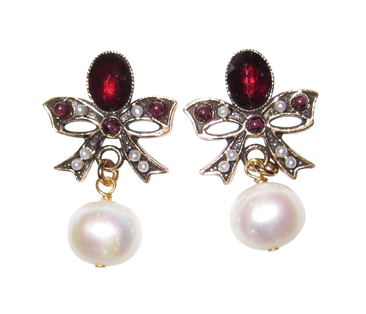 Verspielte Ohrstecker mit weinroten Granatsteinen verschiedener Размер und kleinen Süßwasserperlen. Der Anhänger mit einer großen Süßwasserperle verleiht den Ohrringen einen anmutigen Eindruck. Die stilvollen Ohrringe sind Messing vergoldet. Die Romantikerinnen unter den Frauen werden diese nostalgischen Ohrringe in Schleifenform lieben. Diese edlen, eleganten Ohrringe werden in Florenz in der Werkstatt des berühmten italienischen Designers Giampiero Alcozer in liebevoller Handarbeit gefertigt. Sie sind inspiriert durch historischen Schmuck der Renaissance und des Barock. Durch ihr außergewöhnliches Design sind sie ideal für Feste und Hochzeiten - aber auch ein stilvoller Begleiter für jeden Tag. Maße der Ohrringe: Höhe: 3,2 cm, Breite: 2,0 cm.