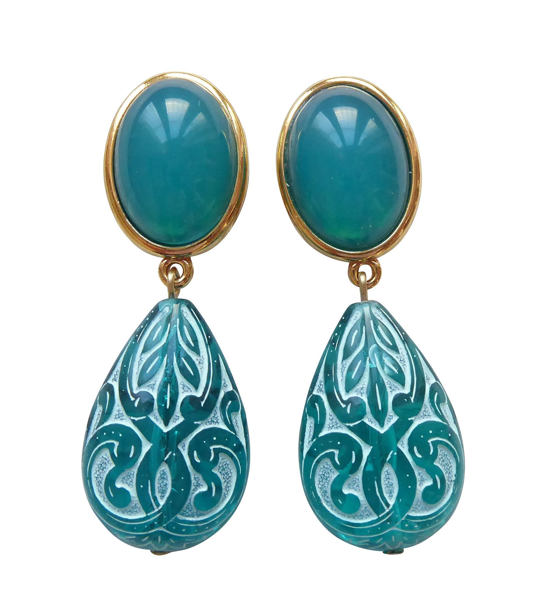 Ausgefallene Clip-Ohrstecker (für Ohrlöcher) von JustWin mit einem ovalen Stein in einem leuchtenden Lagunen-Grün und mit einem tropfenförmigen petrol-grünen Anhänger, der mit Ornamenten verziert ist. Der Stein und der Anhänger bestehen aus Acryl, so dass die Ohrringe extrem leicht sind. Bei dem Material der Ohrringe handelt es sich um eine antiallergische Metalllegierung mit einer Gelbvergoldung. Durch ihre Размер wirken die Ohrringe besonders eindrucksvoll! Hinter dem Label „JustWin“ stehen die beiden Designer Kurt Justmann und Paul Winter, die Schmuck für Frauen entwerfen, die voluminöse Designs lieben. Die extravaganten, handgearbeiteten Kreationen spielen mit auffälligen Farben, Formen und Oberflächen. Der hochwertige Modeschmuck ist bereits auf der Titelseite der deutschen VOGUE zu bewundern gewesen und erscheint regelmäßig in der Presse. Liebhaberinnen von Statement-Stücken werden bei JustWin nicht widerstehen können! Maße der Ohrringe: Höhe: 5,0 cm, Breite: 2,0 cm.