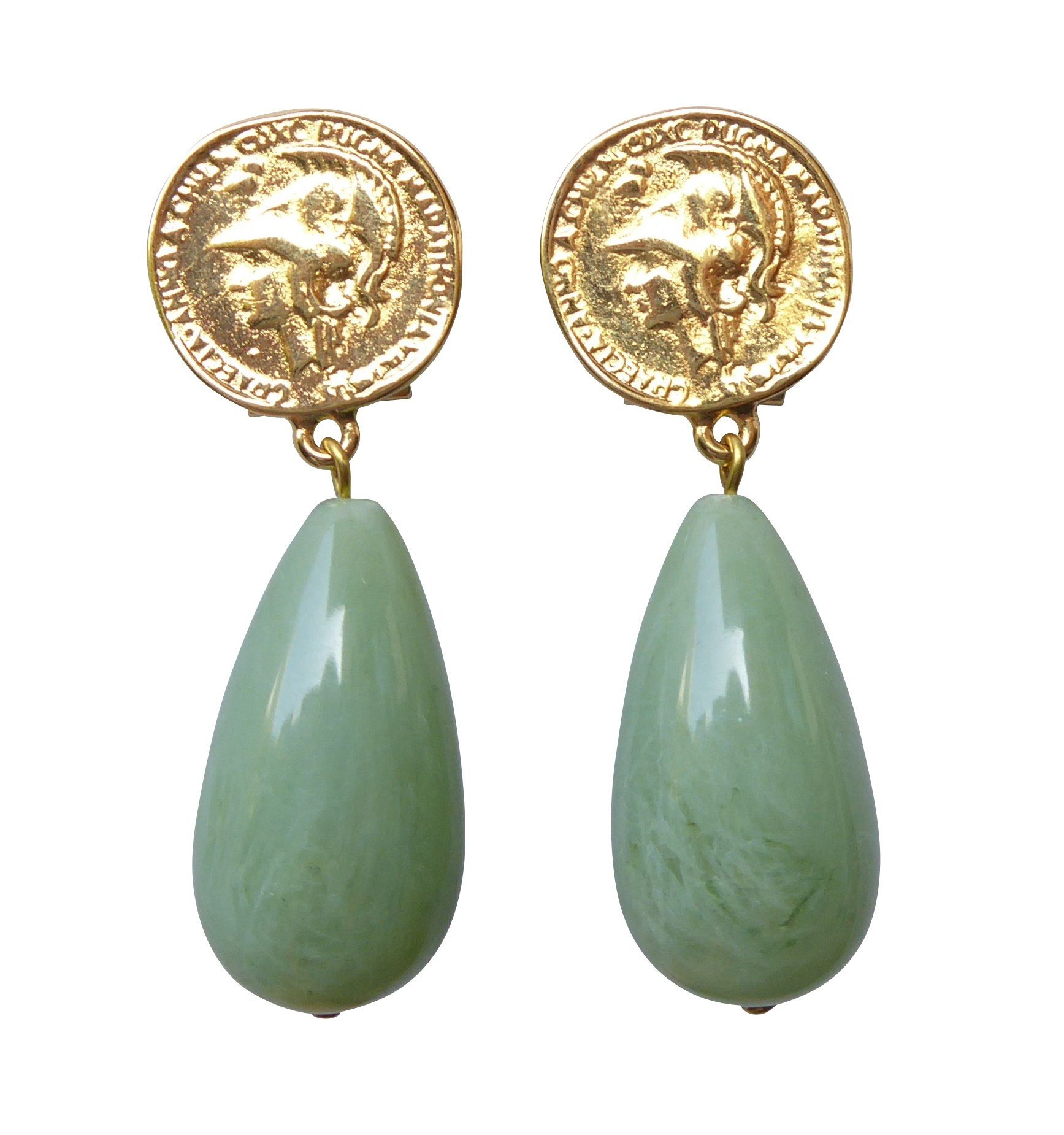 Mal etwas ganz anderes: große vergoldete Clip-Ohrstecker (für Ohrlöcher) von JustWin in Form einer römischen Münze. Der tropfenförmige jade-farbene Anhänger bildet einen schönen Kontrast zu der Münze. Der Anhänger besteht aus Acryl, so dass die Ohrringe schön leicht sind. Bei dem Material der Ohrringe handelt es sich um eine antiallergische Metalllegierung mit einer Gelbvergoldung. Das ausgefallene Design dieses Schmuckstücks verleiht Ihnen ein besonderes Flair! Hinter dem Label „JustWin“ stehen die beiden Designer Kurt Justmann und Paul Winter, die Schmuck für Frauen entwerfen, die voluminöse Designs lieben. Die extravaganten, handgearbeiteten Kreationen spielen mit auffälligen Farben, Formen und Oberflächen. Der hochwertige Modeschmuck ist bereits auf der Titelseite der deutschen VOGUE zu bewundern gewesen und erscheint regelmäßig in der Presse. Liebhaberinnen von Statement-Stücken werden bei JustWin nicht widerstehen können! Maße der Ohrringe: Höhe: 4,7 cm, Breite: 1,6 cm.