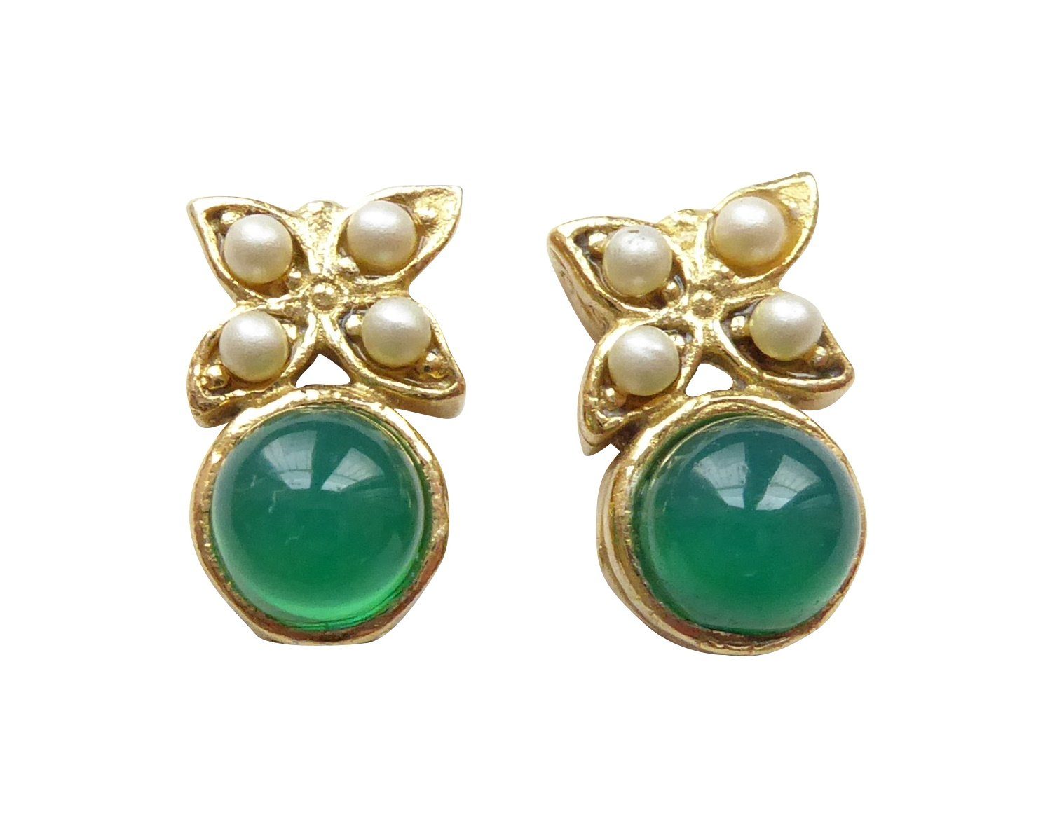 Wie aus Großmutters Schmuckschatulle: romantische, zierliche Ohrstecker mit einem grünen Achat, die unter einer Blüte mit kleinen Süßwasserperlen befestigt ist. Das Material der Ohrringe besteht aus einer vergoldeten Legierung aus Silber und Kupfer, ist antiallergisch und gut verträglich. Ein nostalgischer Hingucker! Diese stilvollen, zeitlosen Ohrringe werden in Florenz hergestellt. Sie werden in einer kleinen Schmuckwerkstatt in aufwendiger Handarbeit gefertigt, so dass jedes Schmuckstück ein einzigartiges Unikat ist. Daher sind kleine Abweichungen zu dem Bild möglich. Als Vorbild für diese exklusiven Ohrringe dienen Schmuckstücke von Renaissance-Gemälden aus den Uffizien. Maße der Ohrringe: Höhe: 1,4 cm, Breite: 0,8 cm.