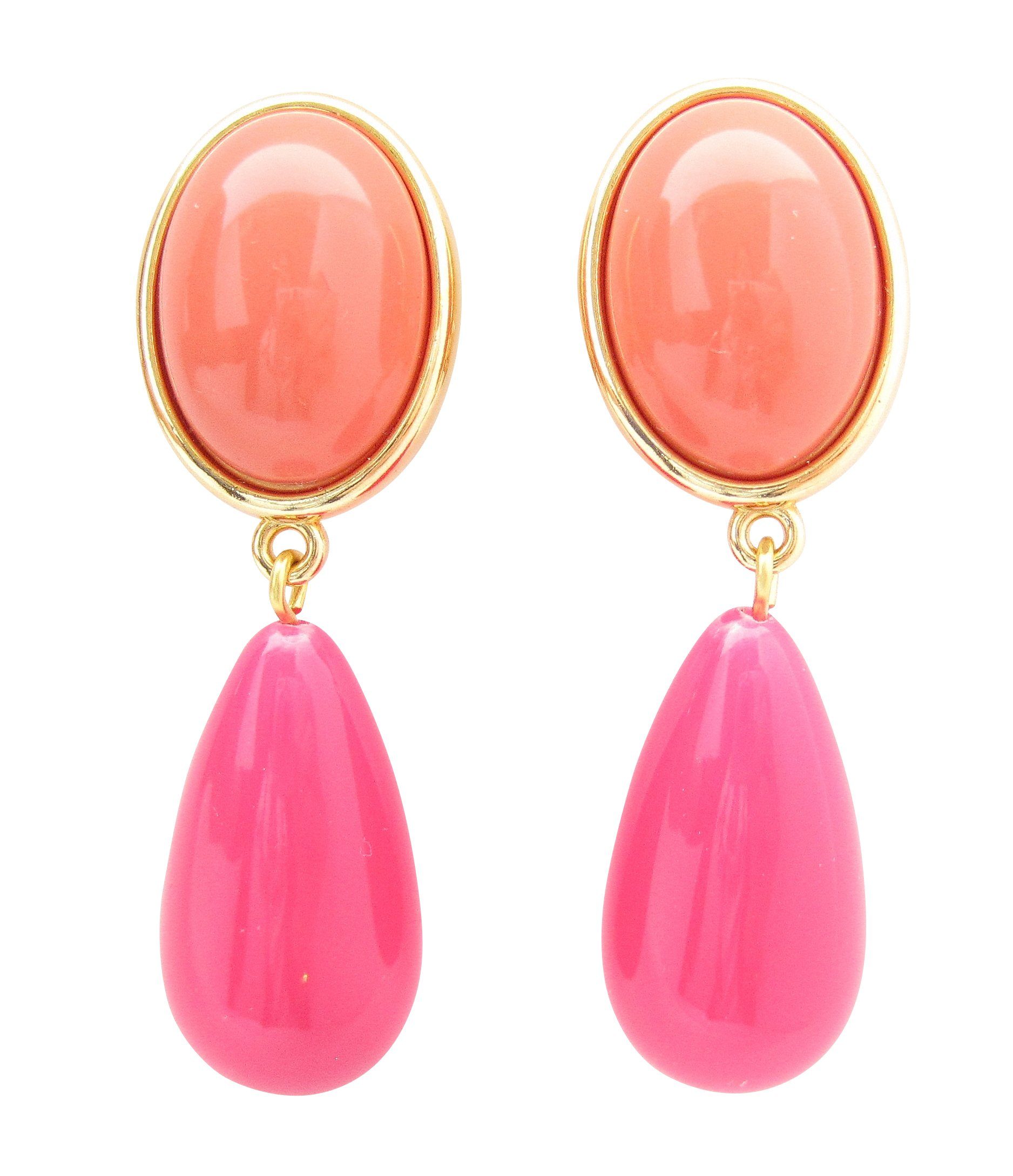 Opulente Clip-Ohrstecker (für Ohrlöcher) von JustWin mit einem ovalen Stein in einem schönen Orange und mit einem tropfenförmigen fuchsiafarbenen Anhänger. Der Stein und der Anhänger bestehen aus Acryl, so dass die Ohrringe extrem leicht sind. Bei dem Material der Ohrringe handelt es sich um eine antiallergische Metalllegierung mit einer Gelbvergoldung. Diese großen Ohrringe sind ein absoluter Hingucker! Hinter dem Label „JustWin“ stehen die beiden Designer Kurt Justmann und Paul Winter, die Schmuck für Frauen entwerfen, die voluminöse Designs lieben. Die extravaganten, handgearbeiteten Kreationen spielen mit auffälligen Farben, Formen und Oberflächen. Der ins Auge fallende Modeschmuck ist bereits auf der Titelseite der deutschen VOGUE zu bewundern gewesen und erscheint regelmäßig in der Presse. Liebhaberinnen von Statement-Stücken werden bei JustWin nicht widerstehen können! Maße der Ohrringe: Höhe: 5,0 cm, Breite: 1,5 cm.