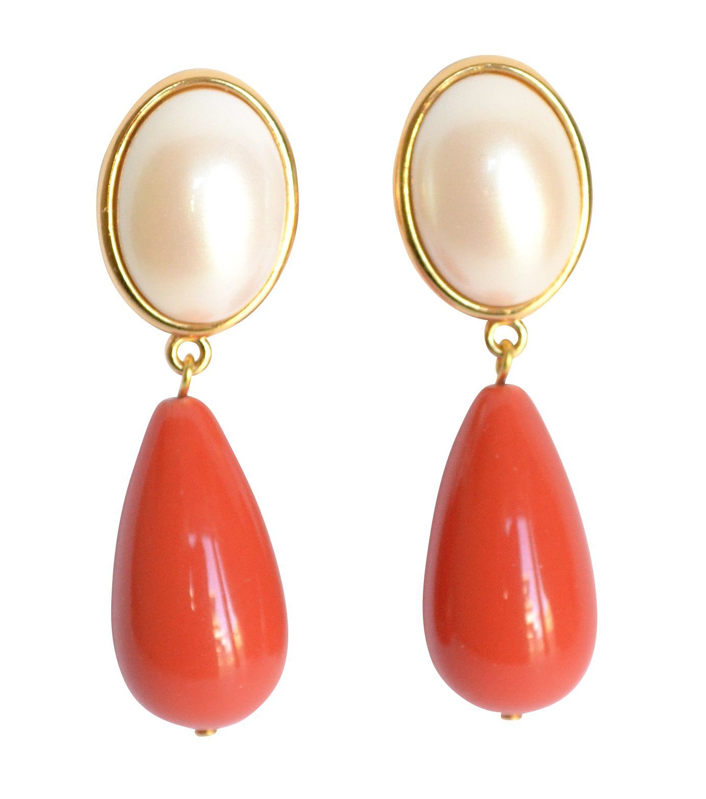 Opulente Clip-Ohrstecker (für Ohrlöcher) von JustWin mit einem ovalen Stein, der aussieht wie eine weiße Perle, und mit einem tropfenförmigen orange-korallfarbenen Anhänger. Der Stein und der Anhänger bestehen aus Acryl, so dass die Ohrringe extrem leicht sind. Bei dem Material der Ohrringe handelt es sich um eine antiallergische Metalllegierung mit einer Gelbvergoldung. Diese großen Ohrringe sind ein absoluter Hingucker! Hinter dem Label „JustWin“ stehen die beiden Designer Kurt Justmann und Paul Winter, die Schmuck für Frauen entwerfen, die voluminöse Designs lieben. Die extravaganten, handgearbeiteten Kreationen spielen mit auffälligen Farben, Formen und Oberflächen. Der hochwertige Modeschmuck ist bereits auf der Titelseite der deutschen VOGUE zu bewundern gewesen und erscheint regelmäßig in der Presse. Liebhaberinnen von Statement-Stücken werden bei JustWin nicht widerstehen können! Maße der Ohrringe: Höhe: 5,0 cm, Breite: 1,5 cm.
