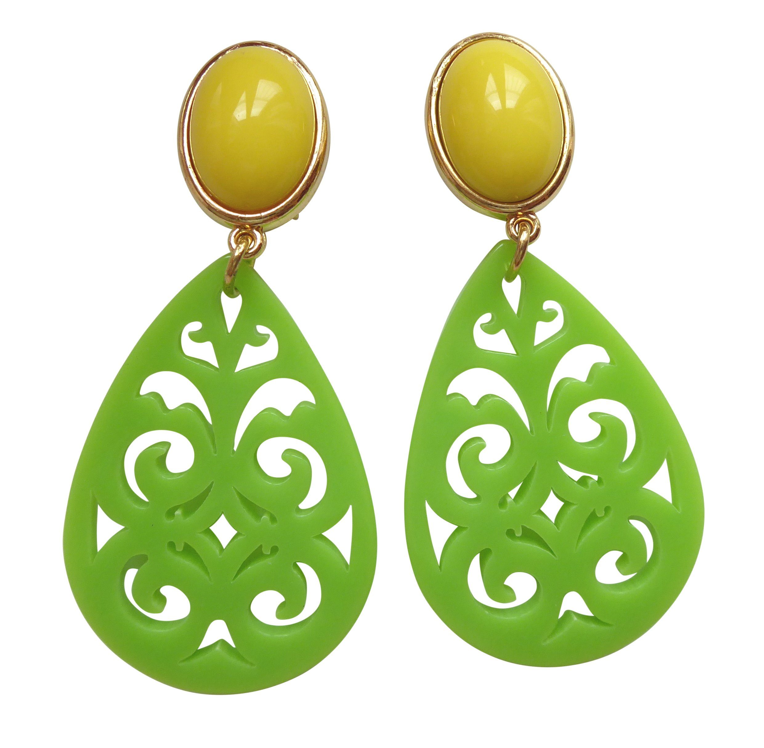Sehr große, auffällige Clip-Ohrstecker (für Ohrlöcher) von JustWin mit einem gelben Stein und einen großen geschnitzten Anhänger in einem knalligen Neon-Grün. Der Stein und der Anhänger bestehen aus Acryl, so dass die Ohrringe extrem leicht sind. Bei dem Material der Ohrringe handelt es sich um eine antiallergische Metalllegierung mit einer Gelbvergoldung. Diese großen Ohrringe sind ein absoluter Hingucker! Hinter dem Label „JustWin“ stehen die beiden Designer Kurt Justmann und Paul Winter, die Schmuck für Frauen entwerfen, die voluminöse Designs lieben. Die extravaganten, handgearbeiteten Kreationen spielen mit auffälligen Farben, Formen und Oberflächen. Der ins Auge fallende Modeschmuck ist bereits auf der Titelseite der deutschen VOGUE zu bewundern gewesen und erscheint regelmäßig in der Presse. Liebhaberinnen von Statement-Stücken werden bei JustWin nicht widerstehen können! Maße der Ohrringe: Höhe: 7,3 cm, Breite: 3,4 cm.