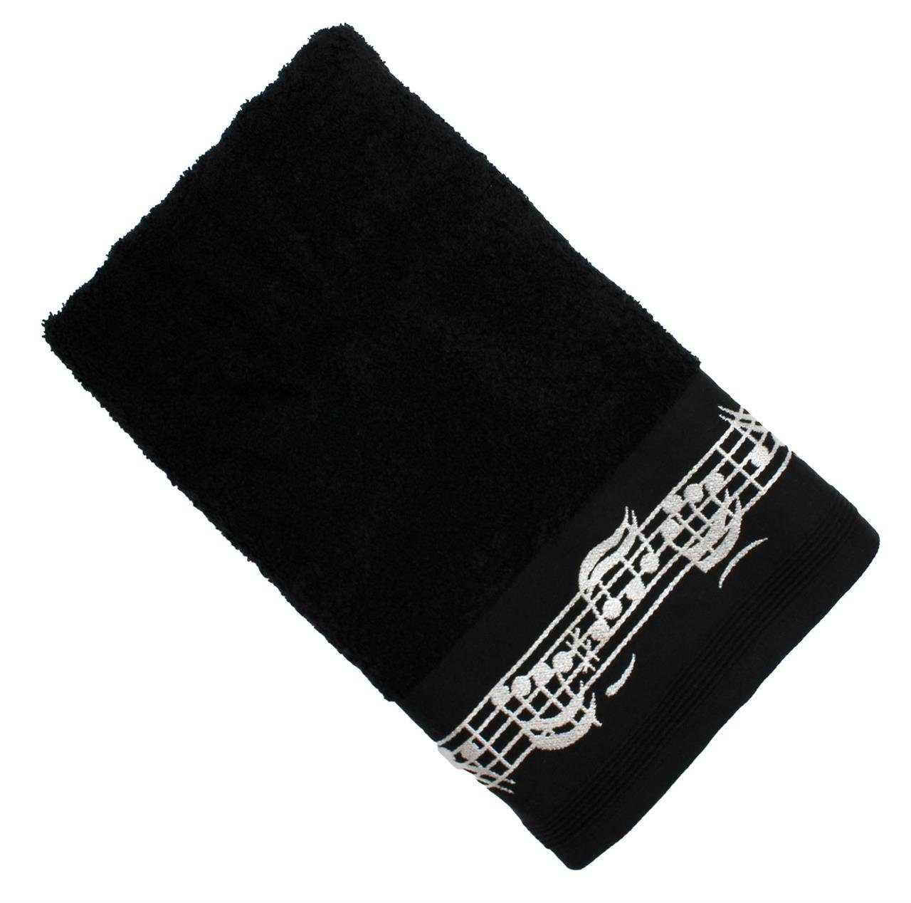 Das schwarze Duschtuch aus hochwertigem Frottee ist die perfekte Wahl für Musikerinnen und Musiker. Mit einer eleganten, eingewebten Notenbordüre und einem strukturierten Notenschlüssel in der Mitte strahlt dieses Duschtuch Liebe zur Musik und Stil aus.