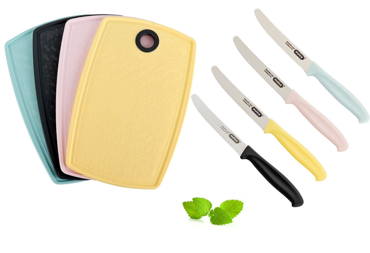 Lieferumfang | 4 vielseitige Allzweckbrettchen / Frühstücksbrettchen in fröhlichen Farben, 4 Universal Küchen- und Tafelmesser in fröhlichen Farben |
