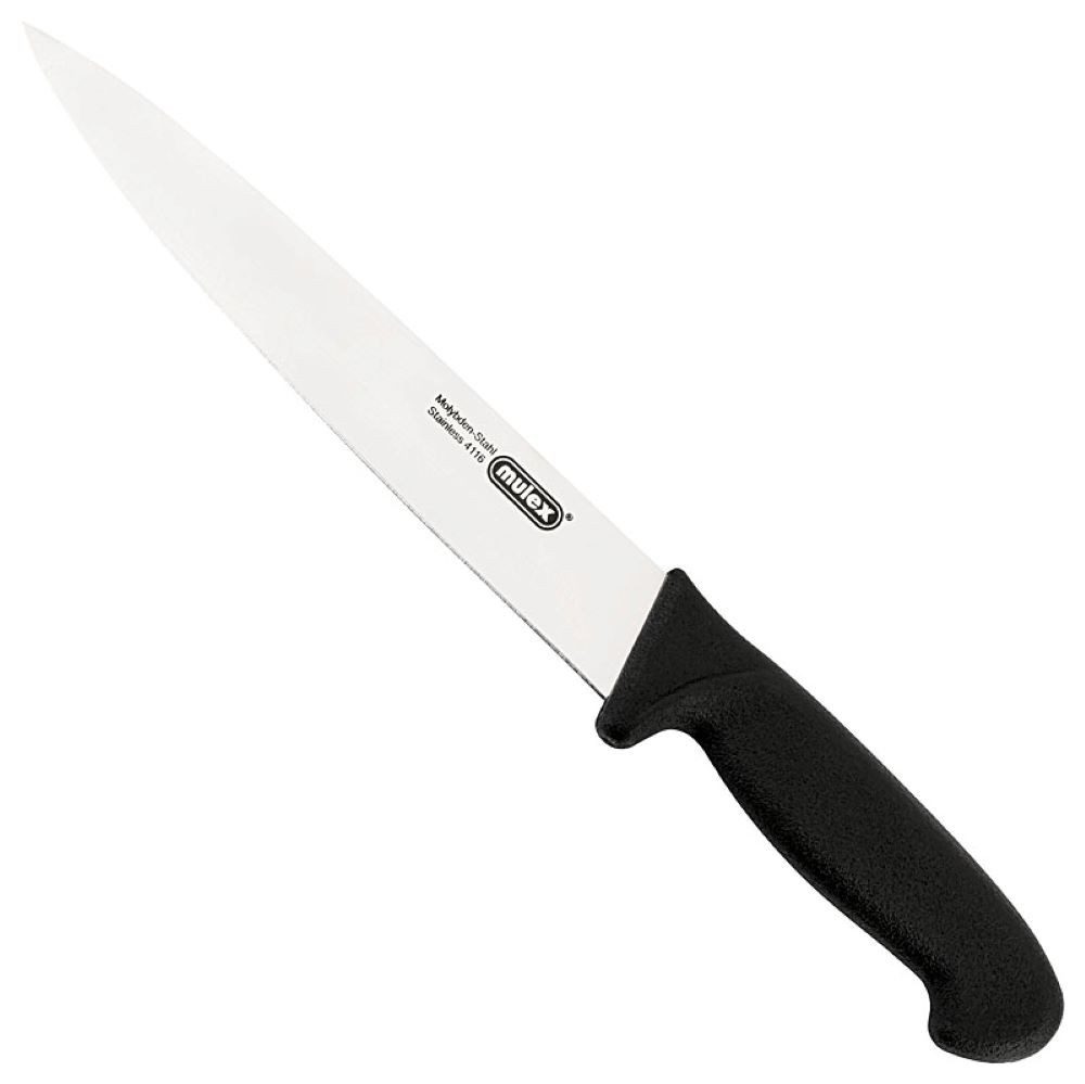 Mulex Kochmesser 19 cm – Profi-Küchenmesser für präzises Schneiden Das Mulex Kochmesser mit 19 cm Klinge ist ein essenzielles Küchenwerkzeug und gehört zur Basisausstattung jeder Küche. Es eignet sich ideal zum Schneiden von Fleisch, Fisch und Gemüse sowie zum Wiegen und Hacken von Kräutern und weiteren Zutaten. Die beidseitig geschliffene, lange Klinge verjüngt sich zur Spitze und Schneide, sodass Sie mit minimalem Druck präzise und mühelos arbeiten können – perfekt für feine und exakte Schnitte. Der ergonomische Griff liegt sicher und bequem in der Hand und garantiert eine ausgewogene Balance zwischen Klinge und Griffgewicht. Das sorgt für kontrolliertes, sicheres Schneiden auch bei längeren Anwendungen. Die Klinge besteht aus hochwertiger, rostfreier Molybdän-Vanadium-Stahllegierung deutscher Herstellung, die für hohe Schnitthaltigkeit, Korrosionsbeständigkeit und lange Lebensdauer sorgt. Nach jedem Gebrauch das Messer unter fließendem, lauwarmem Wasser mit einem weichen Schwamm oder Tuch reinigen und anschließend abtrocknen, um die Langlebigkeit und Schärfe der Klinge zu erhalten.