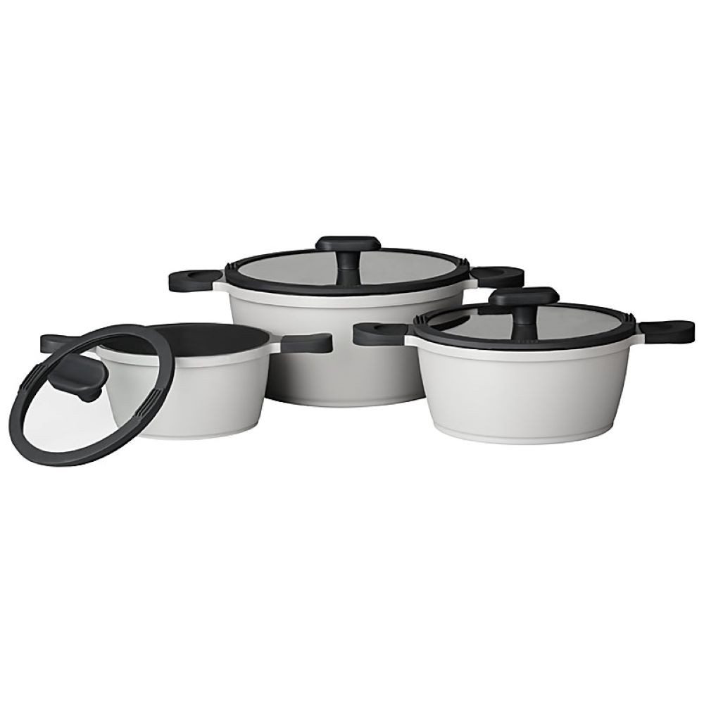 1 Kochtopf 16 cm – ca. 1,4 Liter – hellgrau matt 1 Kochtopf 20 cm – ca. 2,5 Liter – hellgrau matt 1 Kochtopf 24 cm – ca. 4,5 Liter – hellgrau matt inkl. Deckel