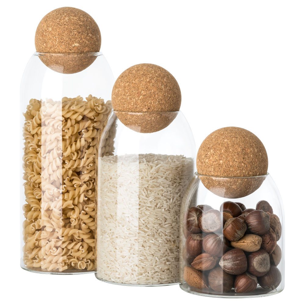 Lieferumfang | 3 Vorratsgläser mit passenden Korkdeckeln, Fassungsvermögen 400 ml, 700 ml, 950 ml, Höhe 10 cm, 15 cm, 20 cm |