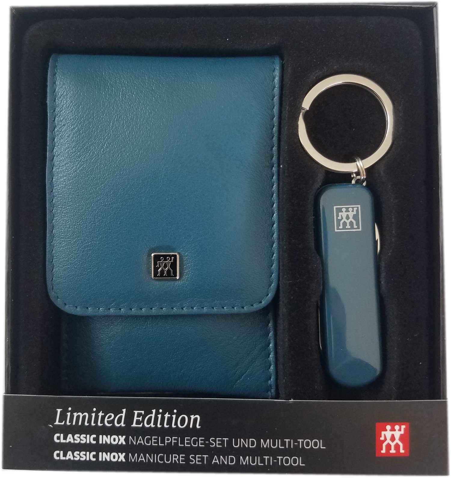 Zwillling ClassicInox Manicure Etui petrol 4tlg.Taschenetui + Multitool/Taschenmesser in Geschenkschachtel Für die schnelle Nagelpflege für Unterwegs • Instrumente in einer edlen Lederhülle in einer Geschenkschachtel verpackt • Edelstahl, rostfrei • Jederzeit zur Hand um kleine Nagelkorrekturen vorzunehmen • Erhältlich in den Farben schwarz, rot und petrol • Bestückung: 1x Nagelknipser 1x Nagelfeile 1x Pinzette 1x Multi Multi-Tool in passender Farbe