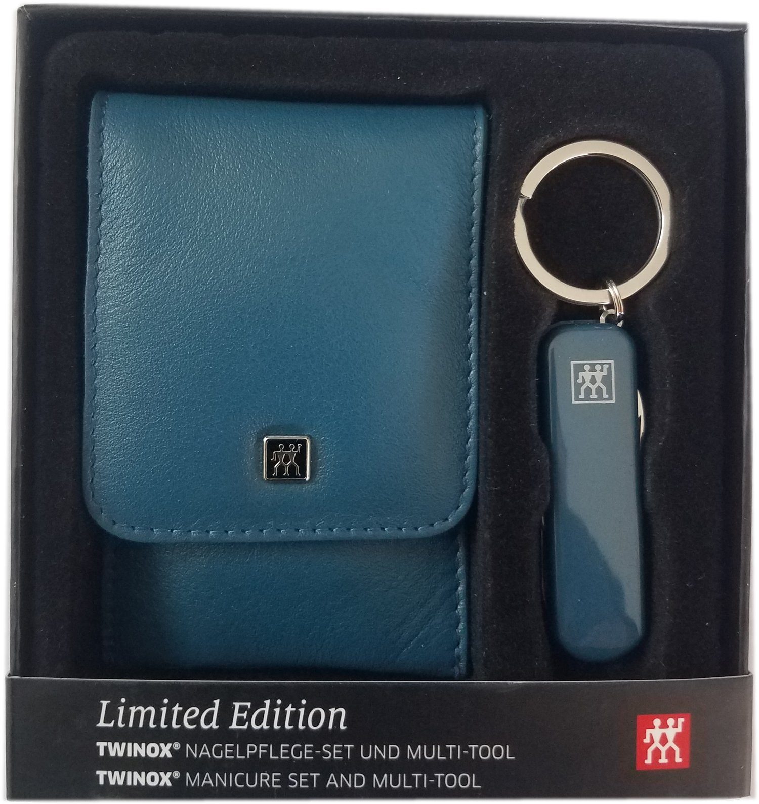 Zwillling Twinox Manicure Etui petrol 4tlg.Taschenetui + Multitool/Taschenmesser in Geschenkschachtel Für die schnelle Nagelpflege für Unterwegs • Instrumente in einer edlen Lederhülle in einer Geschenkschachtel verpackt • Satinierter Edelstahl, rostfrei • Jederzeit zur Hand um kleine Nagelkorrekturen vorzunehmen • Erhältlich in den Farben schwarz, rot und petrol • Bestückung: 1x Nagelknipser 1x Nagelfeile 1x 2 in 1 Manicure Instrument 1x Multi Multi-Tool in passender Farbe