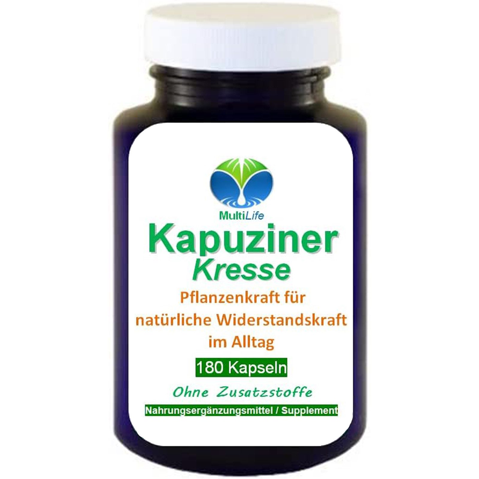 Zutaten | Kapuzinerkresse Kraut mit Samen. Kapselhülle: Gelatine (Rind). |