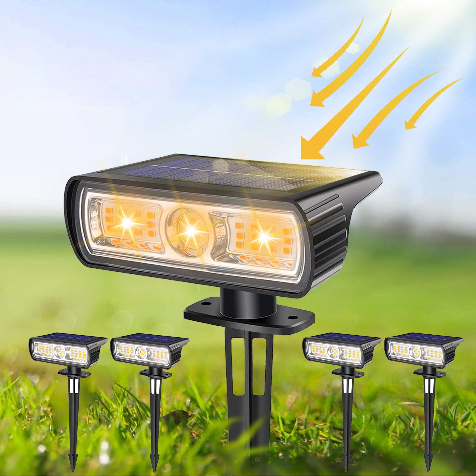1. solare Energieversorgung, keine zusätzlichen Stromkosten, und keine Notwendigkeit, die Batterie zu ersetzen. Eingebauter Lichtsensor steuert die Solarflutlichter automatisch, lädt tagsüber auf und schaltet sich nachts automatisch ein (schalten Sie sie beim ersten Gebrauch in den „Ein“-Modus).