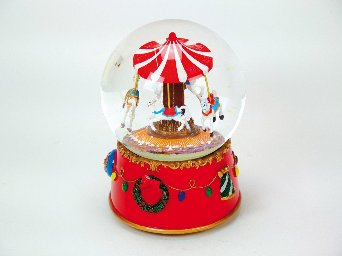 120 mm Schneekugel mit Karussell. Das Karussell mit seinen Pferden dreht sich in der Kugel während eine weihnachtliche Melodie erklingt. Maße: 12,5 x 12,5 x 16,5 cm