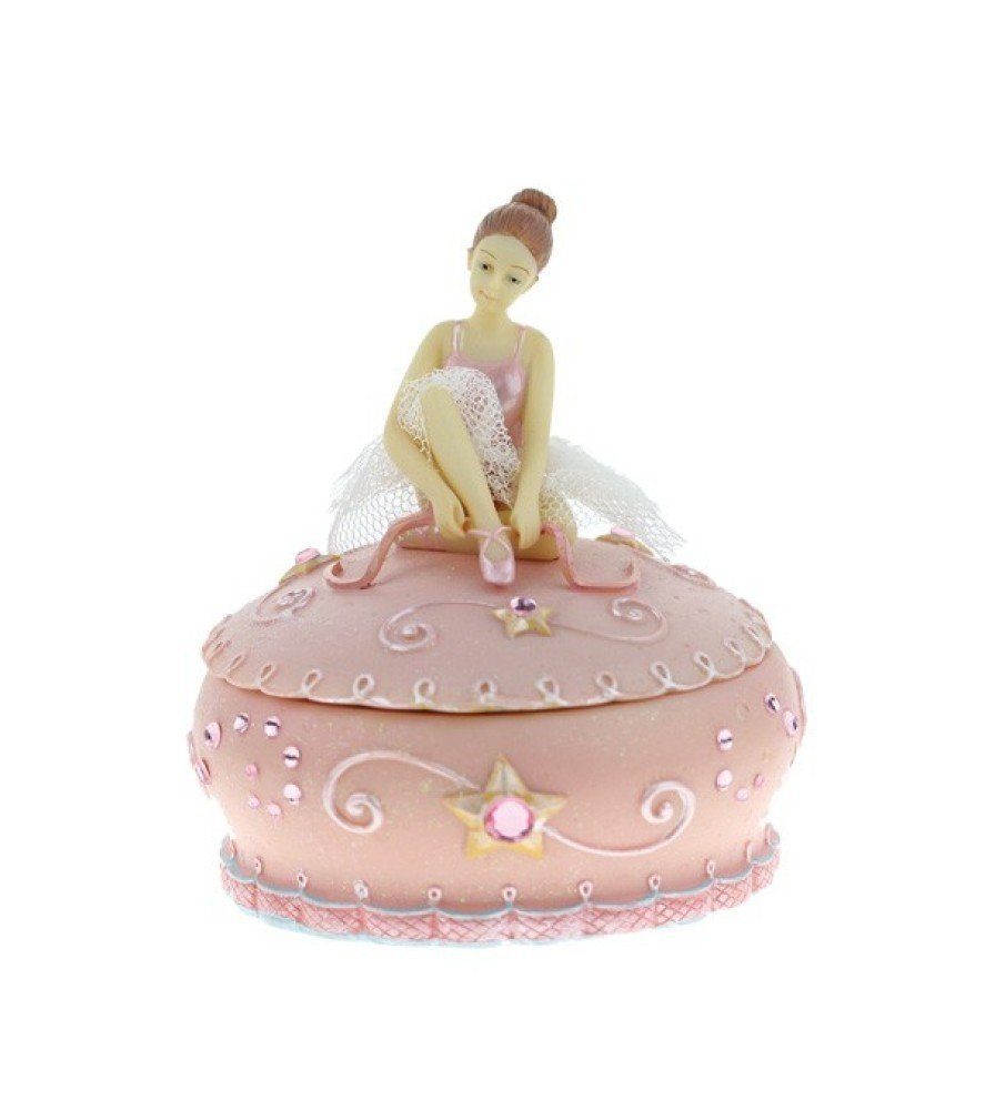 Spieluhr rosa Schmuckdose mit Ballerina aus Polystone. Die kleine rosafarbene Schmuckdose ist mit kleinen Glitzersteinchen und Ornamenten verziert. Auf dem Deckel sitzt verträumt eine kleine Ballerina und bindet ihren Schuh. Zieht man das Spielwerk unter dem Deckel mit dem Schlüssel auf, erklingt die Melodie „Kaiserwalzer”. Maße: Ø10x12 cm.