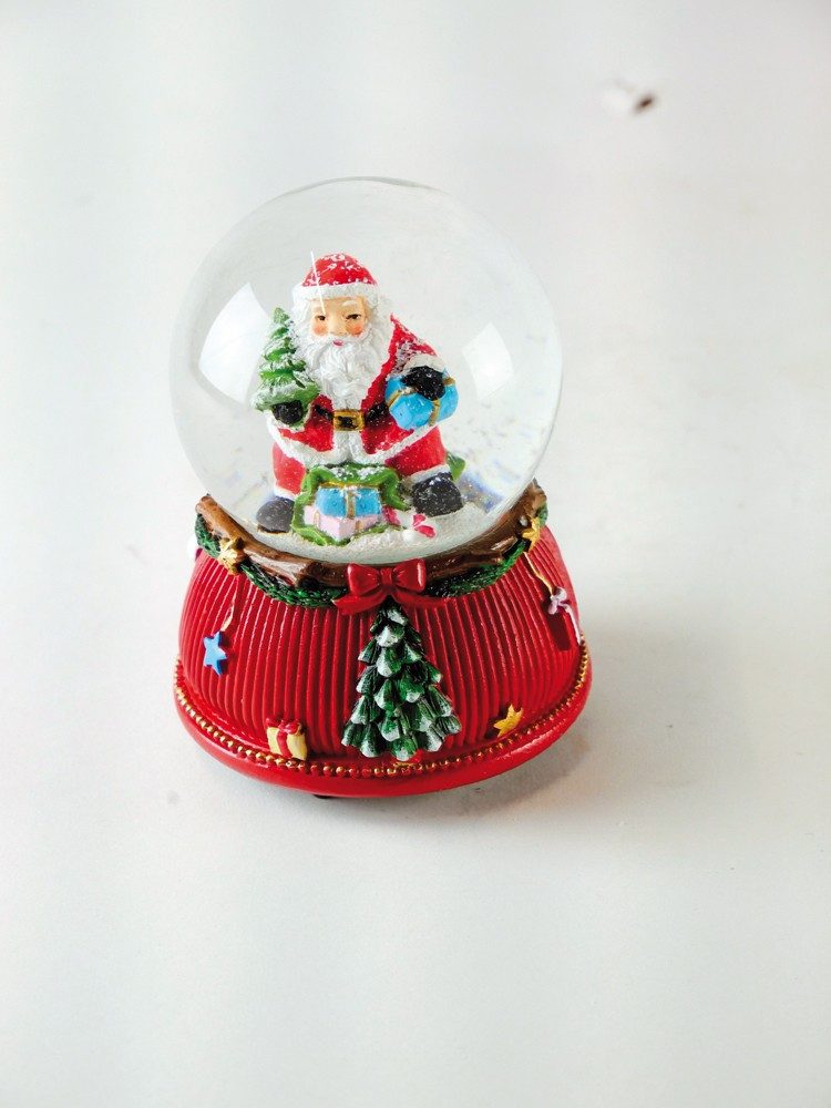 Schneekugel 80 mm Santa mit Baum und Geschenken. Die Kugel spielt eine weihnachtliche Melodie. Maße: 95 x 95 x 120 mm.