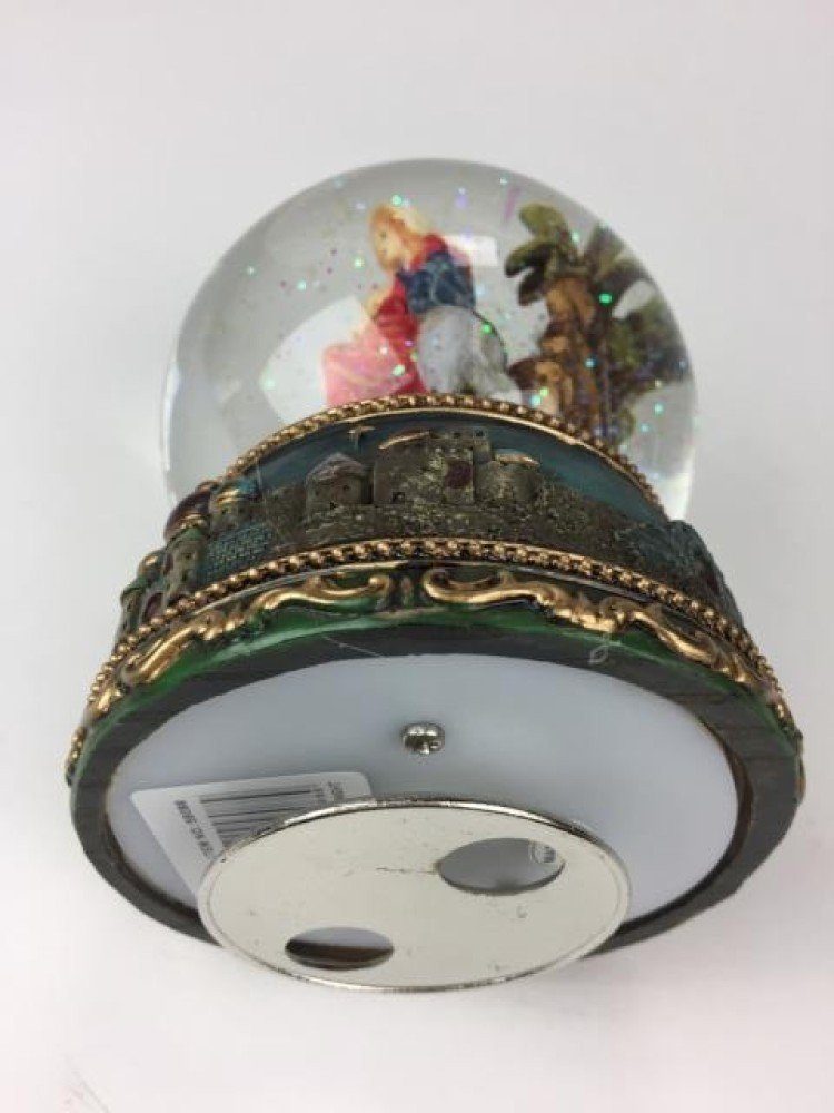 Spieluhr Glitter- Schneekugel Krippe mit Esel. In der mit Glitter gefüllten Kugel sieht man Maria mit dem Jesuskind auf dem Esel, Josef führt sie durch die Wüste. Zieht man das mechanische Spielwerk am Boden der Spieluhr mit dem Drehteller auf, dreht sich die 100 mm Kugel um sich selbst, während die Melodie „Stille Nacht” erklingt. Maße: Ø10x14,5 cm.