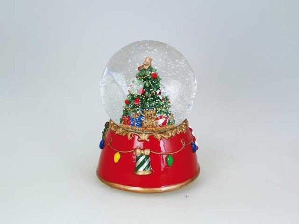 Spieluhr - Schneekugel Weihnachtsbaum mit schön dekoriertem roten Sockel. Globus Durchmesser 80 mm, dreht sich zur Melodie O Tannenbaum.