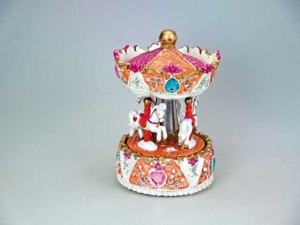 Spieluhr - Glitzer Karussell 155 mm. Das hübsche kleine Karussell ist mit auffälligen Farben in pink und orange gehalten. Beklebt ist es mit türkisfarbenen und rosa Glassteinen. Es drehen sich 3 Karussellpferdchen und es erklingt eine Melodie, wenn man das Spielwerk aufzieht.