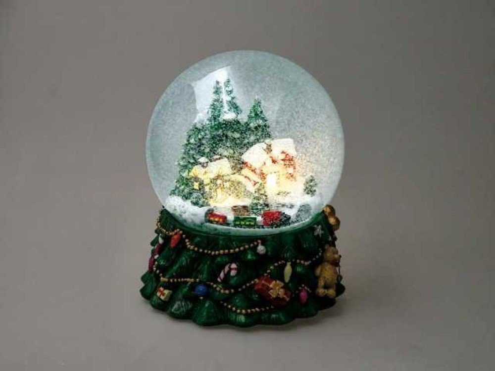 Spieluhr - Schneekugel 150 mm. Beleuchtetes Winterdorf mit Zug. Der Schnee wirbelt automatisch, während ein Medley aus 8 verschiedenen Weihnachtsmelodien gespielt wird. Batteriebetrieben. Abmessungen: 16 x 16 x 19,5 cm.