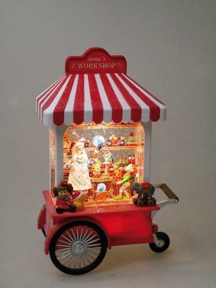 Spieluhr - Schneekugel aus der Werkstatt des Weihnachtsmanns. Der Globus ist beleuchtet und hat eine automatische Schneewirbelfunktion. Sie spielt ein Medley aus 8 verschiedenen Weihnachtsmelodien, während der Schnee wirbelt. Batteriebetrieben. Mit einem 6-Stunden-Timer. Maße: 17,8 x 10,2 x 27,3 cm.