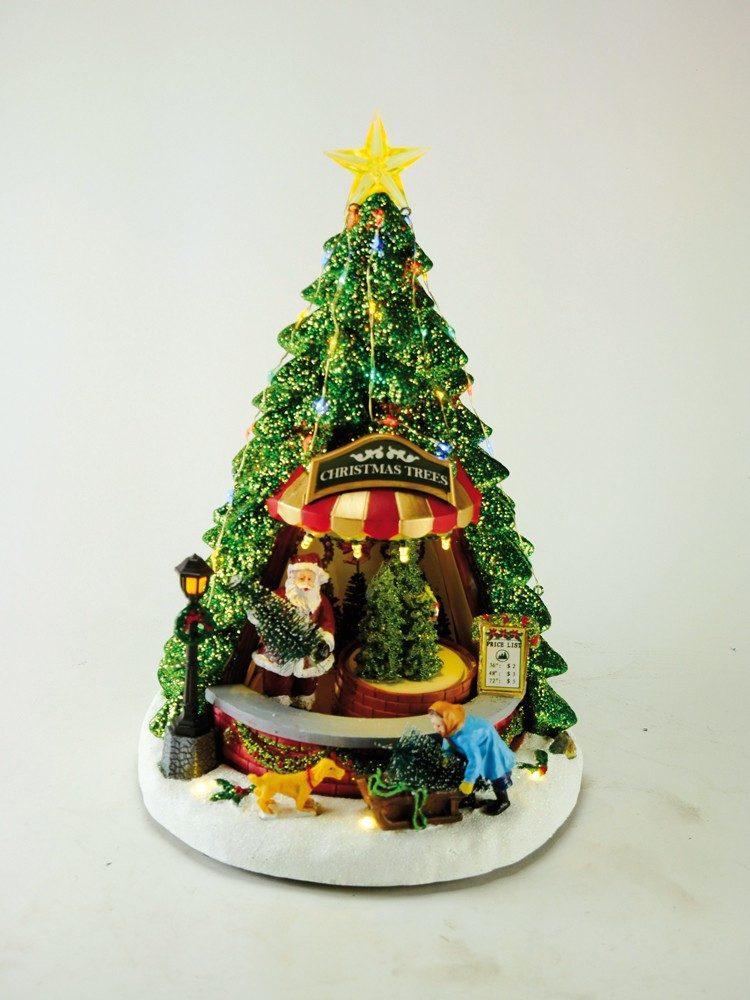 Tannenbaum Verkauf. Die Bäume in der Verkaufsbude drehen sich während ein Medley von 8 verschiedenen weihnachtlichen Melodien erklingt und verschiedene Beleuchtungseffekte ablaufen. 3-Wege Schalter: Aus, Ein ohne Musik, Ein mit Musik. Nicht für Dauerbetrieb geeignet. Batteriebetrieb (3xAA nicht enthalten) oder mit unseren Batterieadaptern mit Netzteil (müssen separat bestellt werden). Maße: 225 x 220 x 330 mm