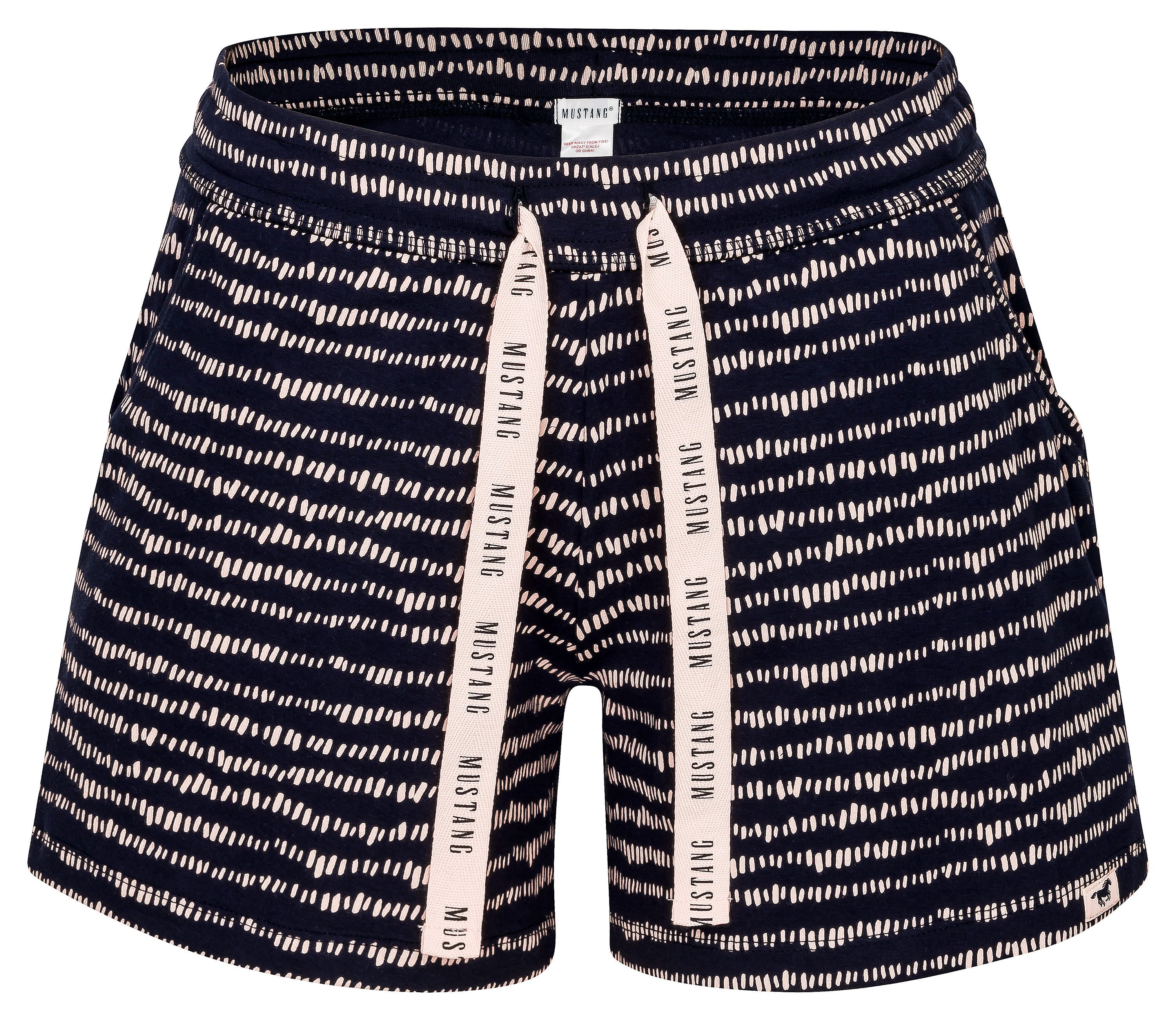 Diese MUSTANG Damen Shorty bietet sowohl Komfort als auch Stil und ist aus hochwertigem Material gemäß dem Ökotex Standard 100 gefertigt. Der Freizeitklassiker präsentiert sich im Alloverdruck in den Farben Nightsky und Peach mit praktischen, seitlichen Eingriffstaschen. Der Bund hat ein rosafarbenes Band mit kleinem Mustang - Logoprint verziert zur individuellen Weitenregulierung.