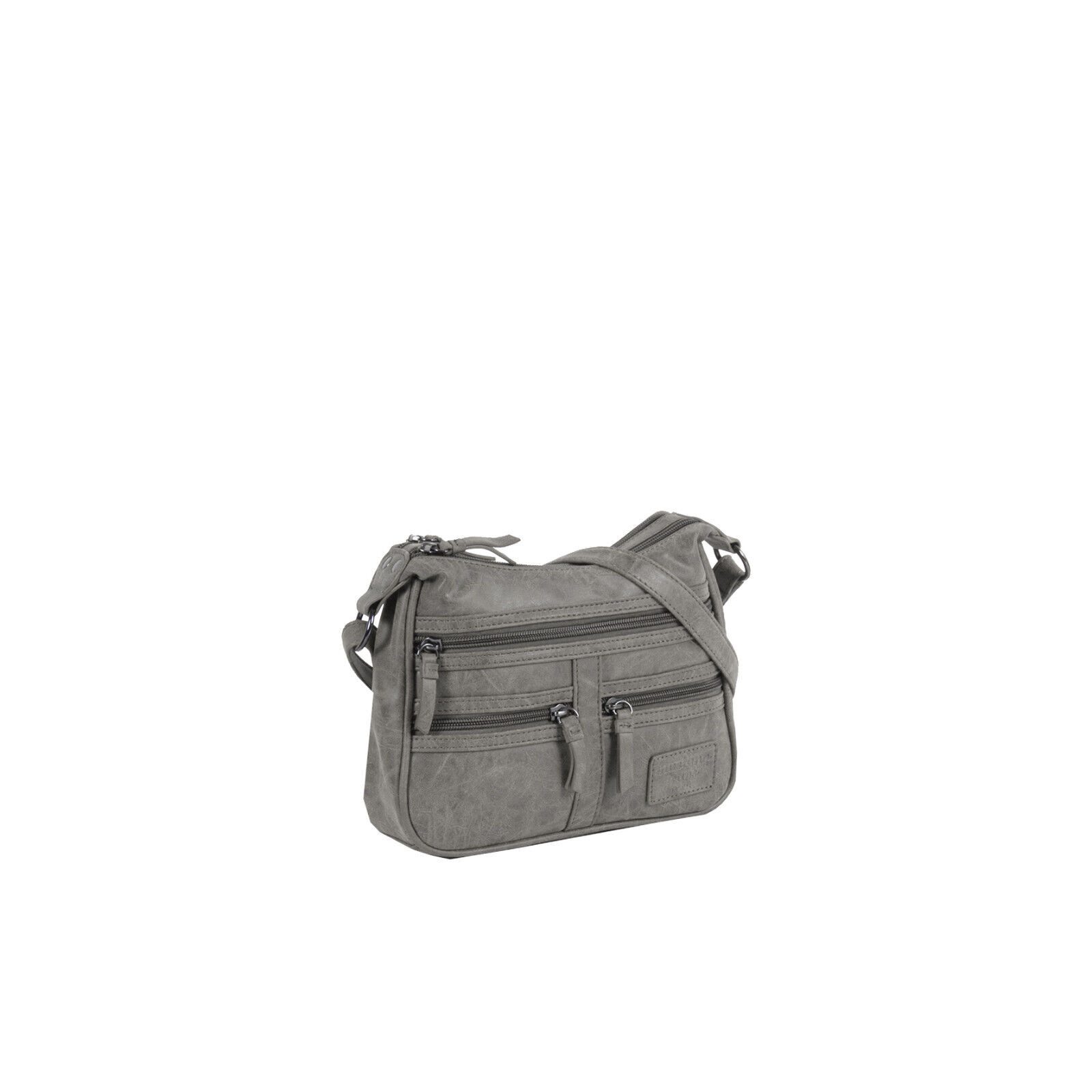 Die Tasche bietet ein durchdachtes Aufbewahrungssystem mit mehreren Reißverschlusstaschen für optimale Organisation. Auf der Vorderseite befinden sich gleich drei Reißverschlusstaschen, die schnellen Zugriff auf häufig benötigte Gegenstände wie Schlüssel, Tickets oder kleinere Accessoires ermöglichen. Auf der Rückseite sorgt eine zusätzliche Reißverschlusstasche für weitere Stauraumoptionen und Sicherheit.