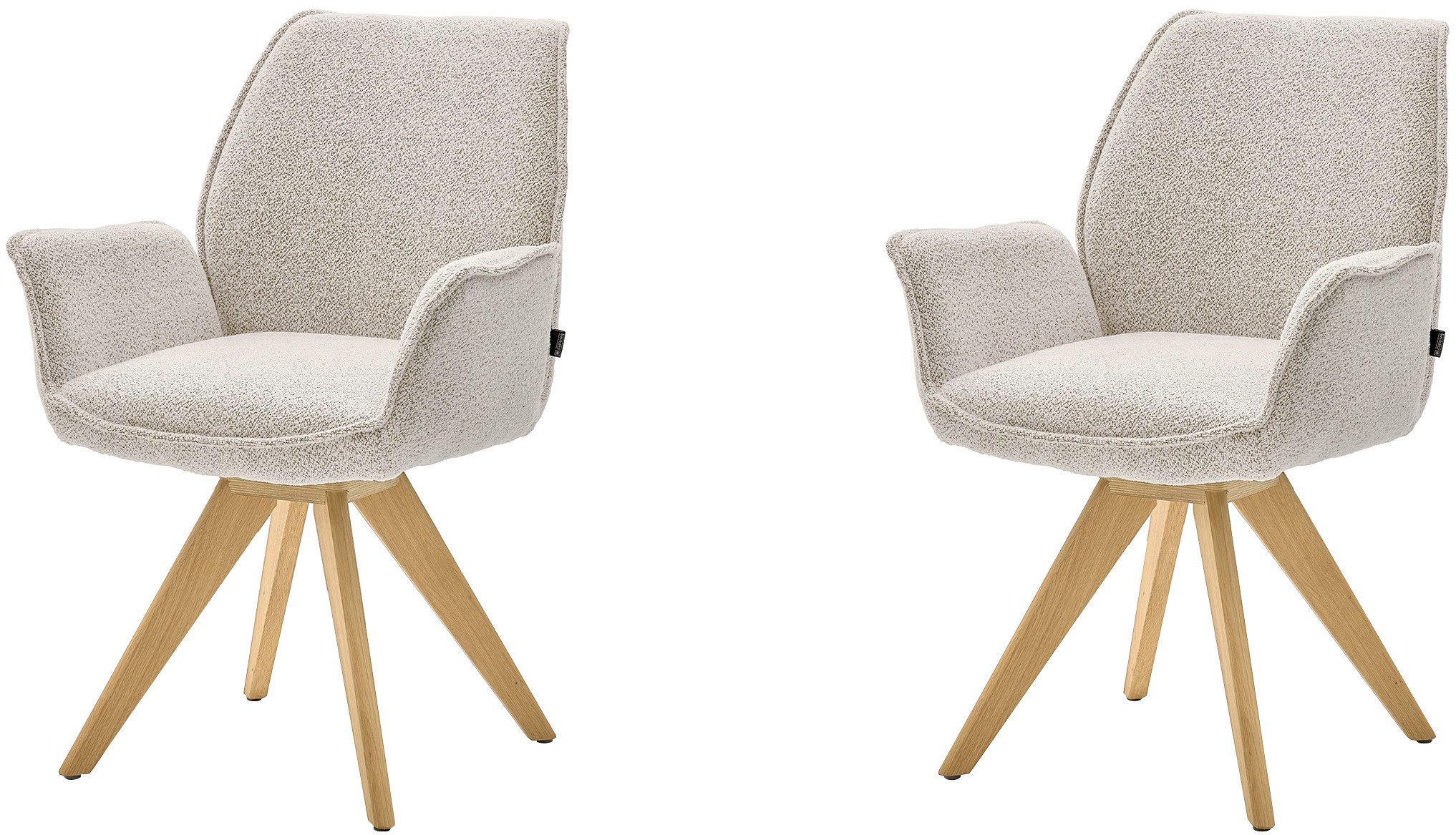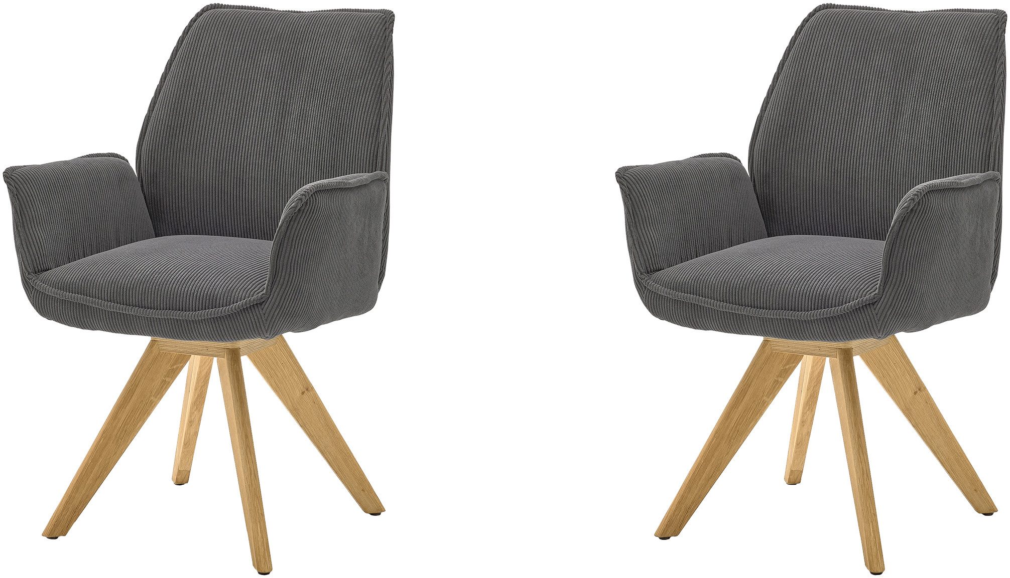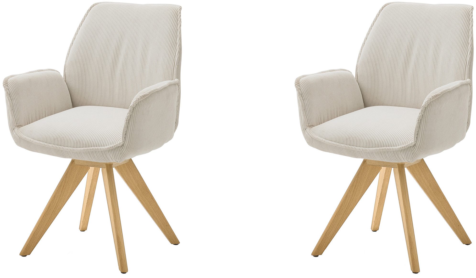 Diese Esszimmerstühle »Tiama« von Musterring macht nicht nur optisch einiges her, sondern punktet auch mit seiner Langlebigkeit. Wenn der Stuhl nebenan oder die Tischbeine im Weg sind, ist es gar nicht so einfach Platz zu nehmen. Die Lösung hierzu ist die Drehfunktion, mit der man sich setzen und aufstehen kann, ohne den Stuhl vorher verrücken zu müssen. Auch wenn du länger sitzen bleibst, ist er komfortabel, denn sowohl die Arm- und Rückenlehne als auch die Sitzfläche sind angenehm gepolstert. Bei etwa 142 Kilogramm liegt die maximale Belastbarkeit. Zwei bis drei Mal jährlich empfiehlt sich zur Pflege des Holzes das Auftragen eines Oberflächenschutzes. Hier kannst du zwischen Öl und Wachs wählen. Das Holzöl bringt die Holzmaserung wieder besonders intensiv zur Geltung, während ein Wachs zusätzlich für einen wasserabweisenden Effekt sorgt. Die Pflege lässt sich mit einem Pinsel oder einem Tuch auftragen.