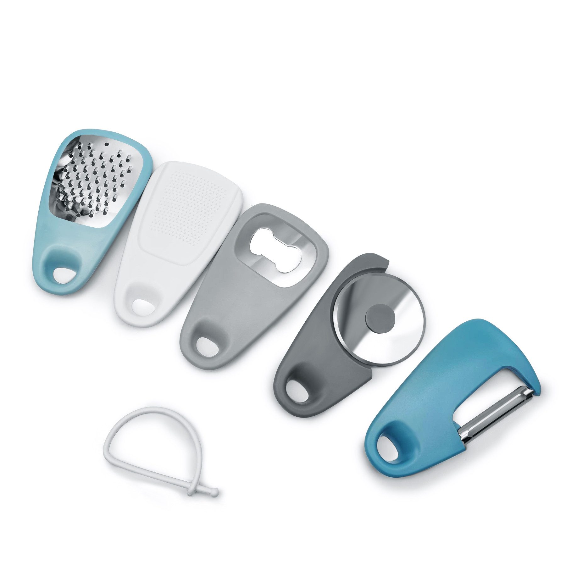 Mit scharfer Klinge für Reibe/Schäler und Pizzaschneider, Vorsicht bei Gebrauch, von Kindern fernhalten.