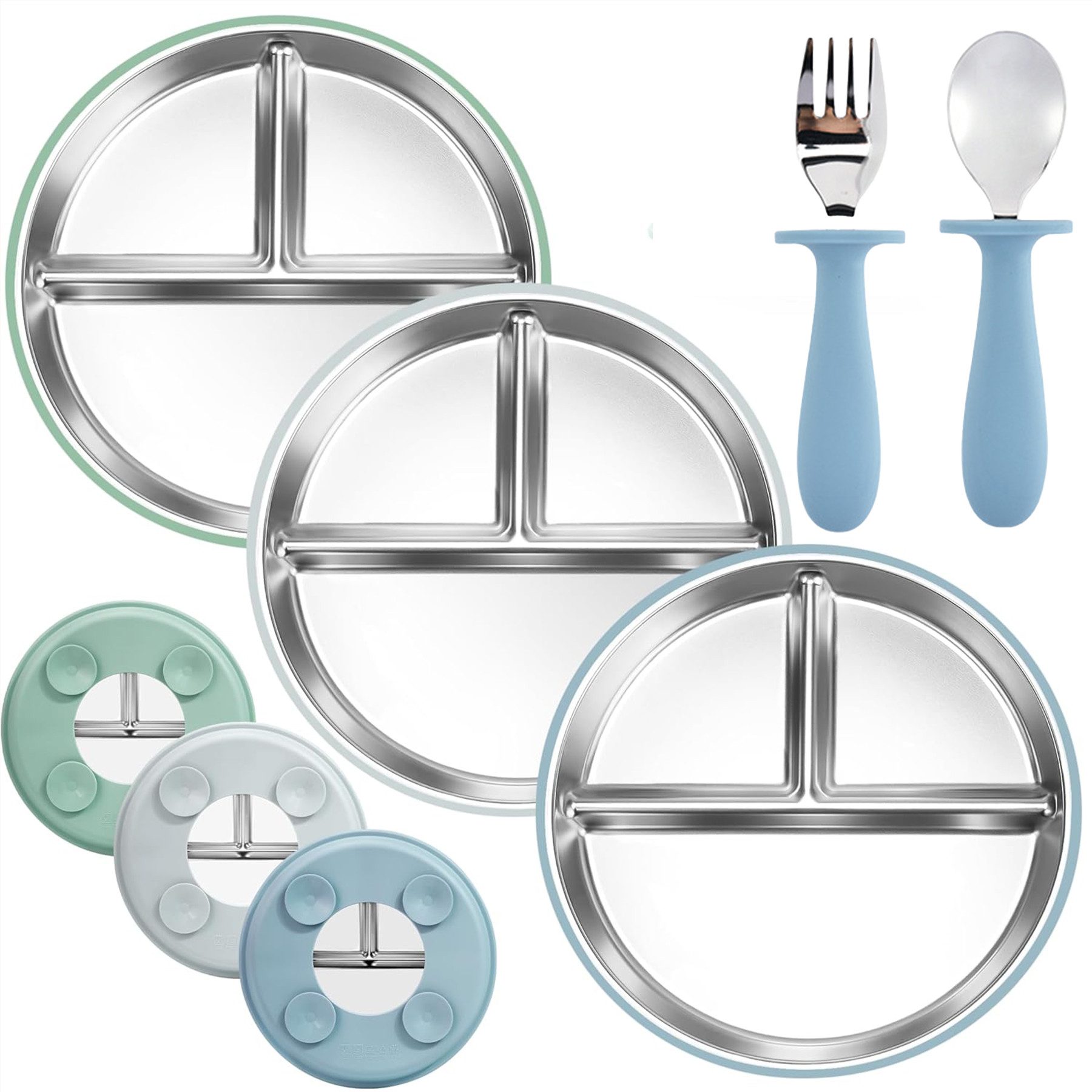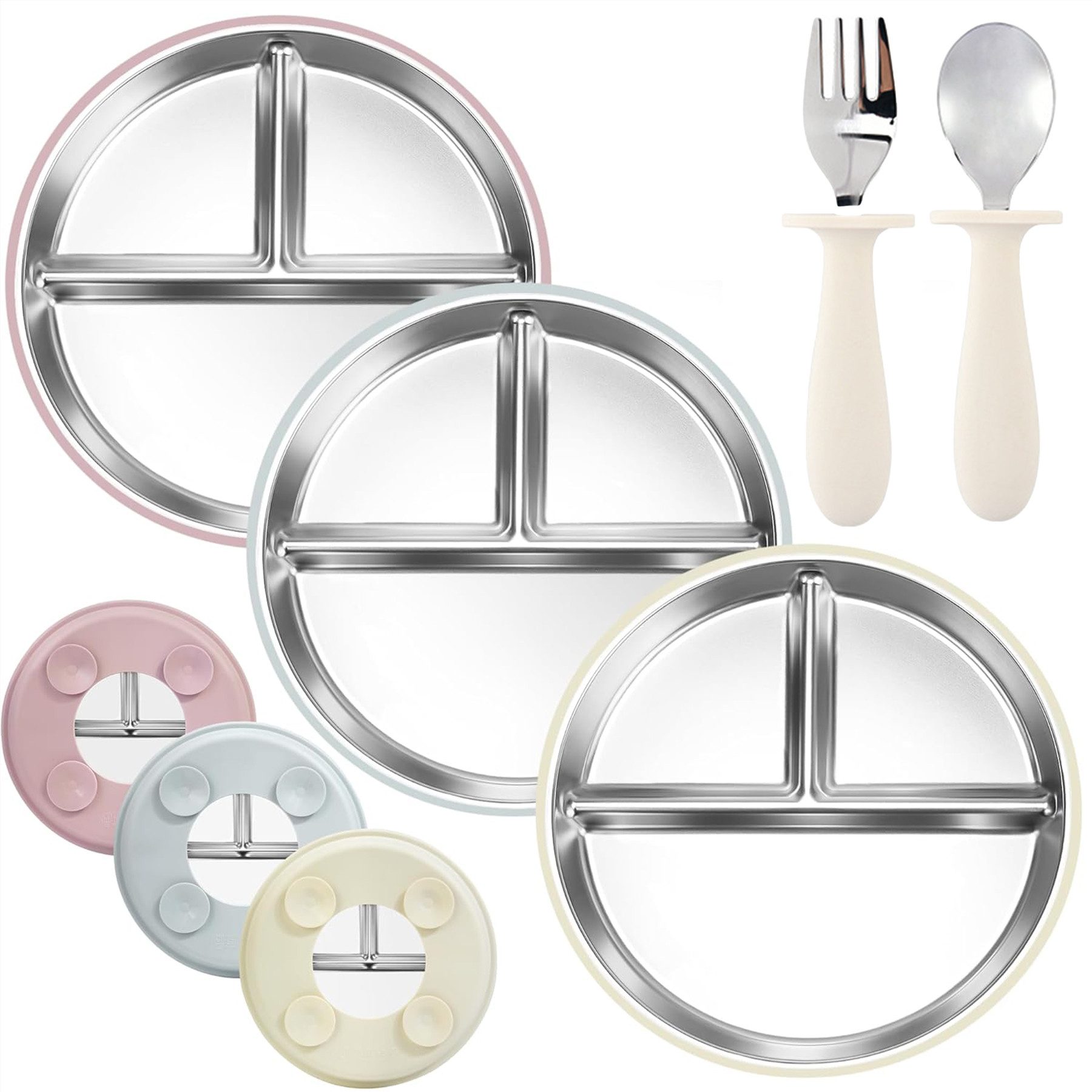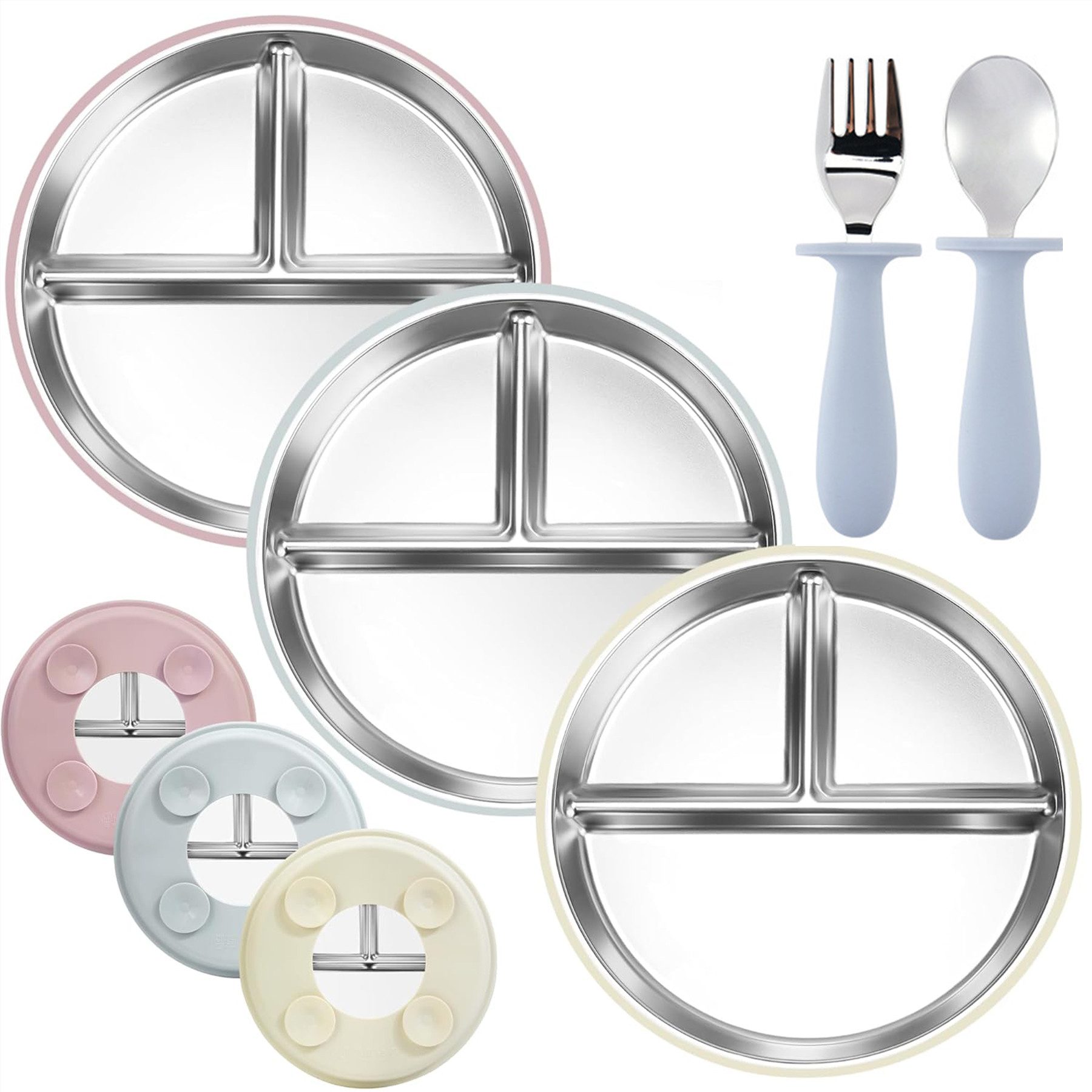 Hergestellt aus 100 % lebensmittelechtem, BPA-freiem Edelstahl – langlebig, rostfrei und speziell für den täglichen Einsatz bei Babys entwickelt. Ausgestattet mit vier gleichmäßig verteilten Silikon-Saugnäpfen, die einen festen Halt auf Hochstühlen und Tischen bieten – verhindert Verschütten und erleichtert das selbstständige Essen.