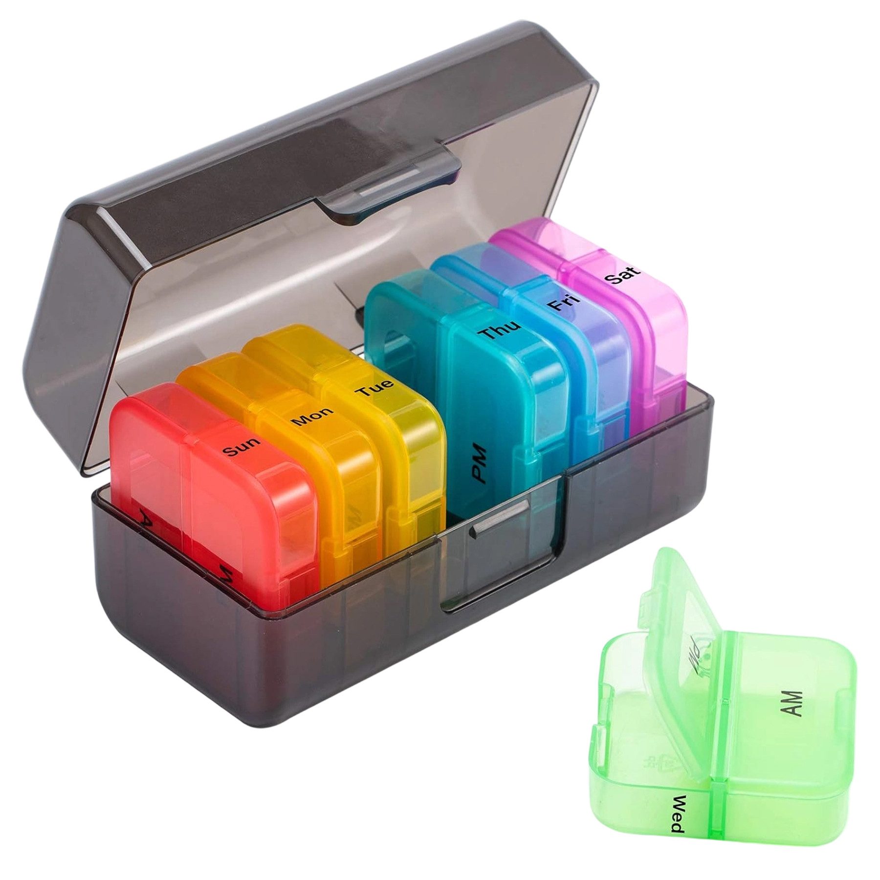 Der wöchentliche tabletten organizer enthält pillendosen 7 tage morgens abends. Jede Pillendose hat 2 Fächer, eines für morgens und eines für abends. Sie sind mit dem Wochentag und dem AM/PM-Symbol bedruckt.
