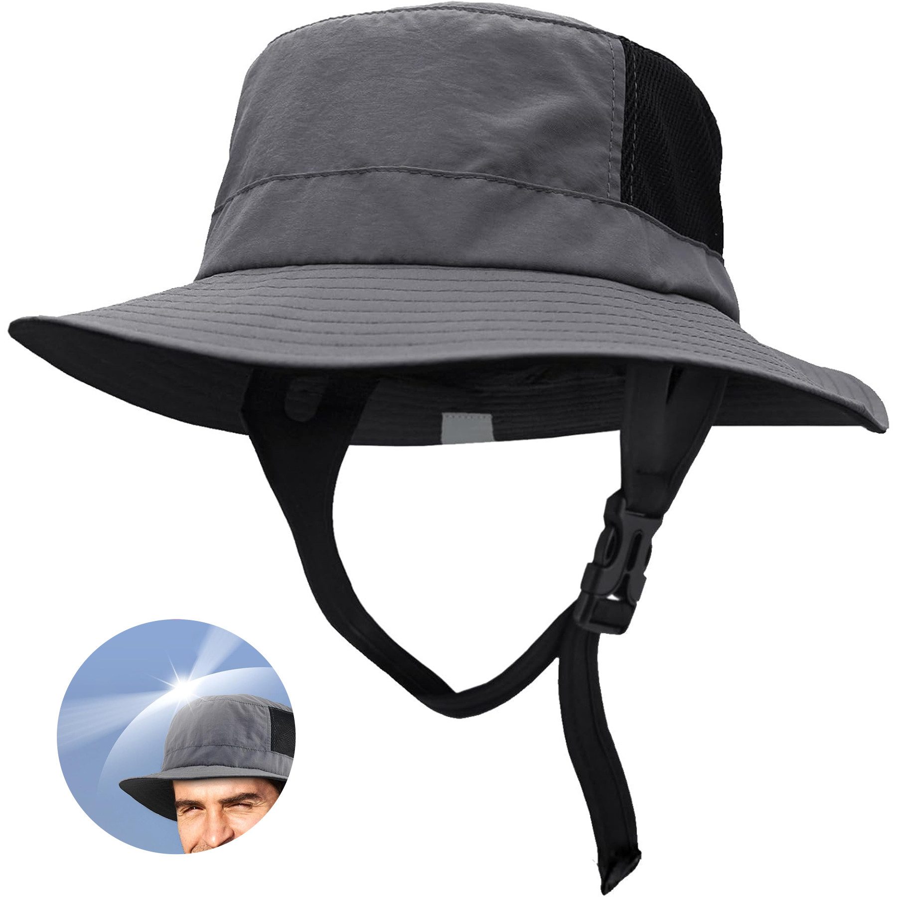 Das Surf-Eimerhut-Design mit verstellbarem, verbreitertem Kinnriemen und starken Nähten, um sicherzustellen, dass die Kappe an Ort und Stelle bleibt und während des Trainings nicht herunterfällt.