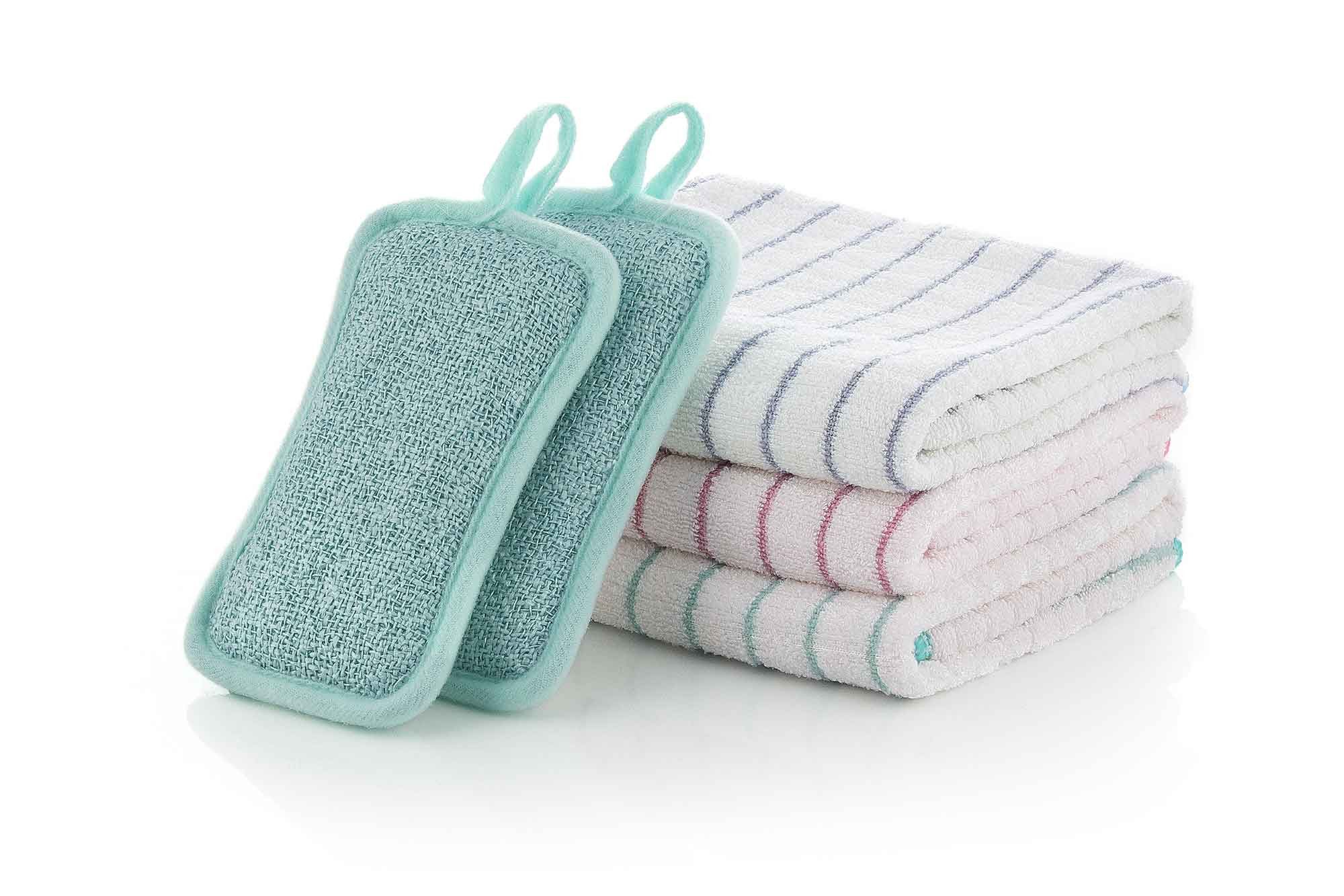 Lieferumfang: 3 Küchentücher aus 60% Polyester / 26% Viskose aus Bambus / 14% Polyamid und 2 Putzschwämmchen