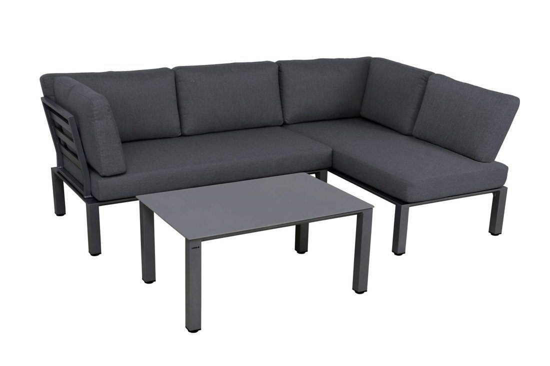 Das Lounge-Set WIDOO bietet 4 Personen einen komfortablen Sitzplatz. Die Seiten der Lounge sind beidseitig montierbar. Die flexible Lounge passt so auf die meisten Balkons oder auch kleinen Terrassen. Die Aluminium Ecklounge besteht aus einem Doppelsitz-Sofa mit Chaiselounge. Dazu gehört ein Kaffeetisch mit beschichteter Glasplatte, einschließlich der Sitz- und Rückenpolster. Sie können es sich auf dem Balkon, auf der Terrasse oder im Wintergarten gemütlich machen und den erstklassigen Komfort der WIDOO Lounge genießen.